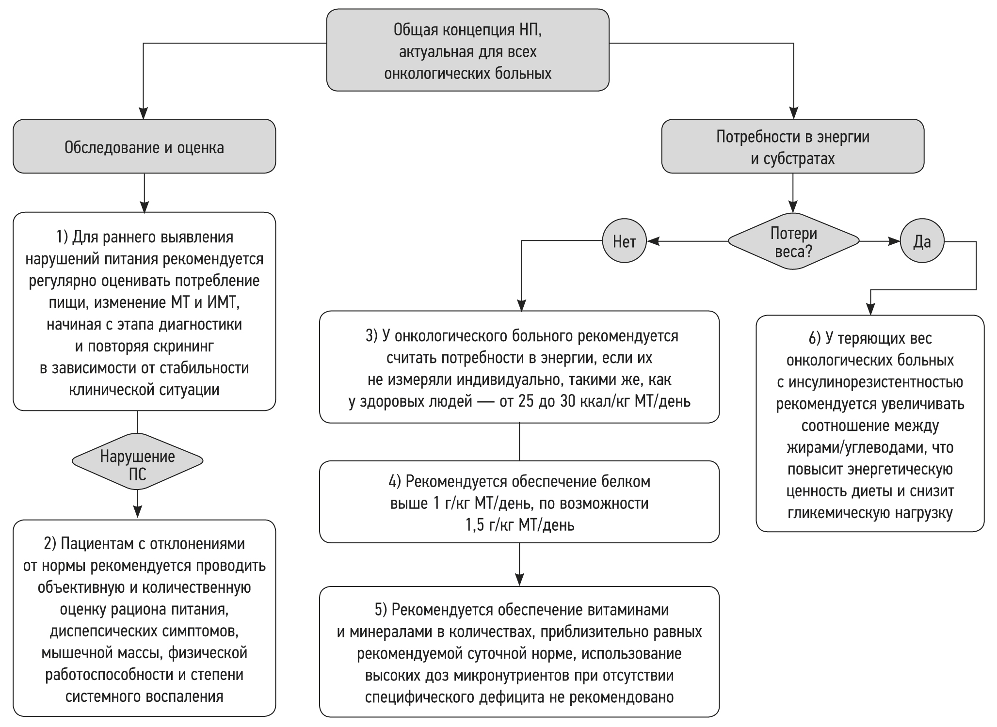 Комментарий. Пациентам с диссеминированным ЗНО рекомендуется проводить скрининг и оценку нутритивного статуса. Следует тщательно оценить все аспекты оказания нутритивной поддержки и прогноз заболевания. Ожидаемая продолжительность жизни имеет решающее значение. Если ожидаемая продолжительность жизни составляет несколько недель, следует уделить больше внимания уменьшению диспепсических симптомов, ограничиться неинвазивными вмешательствами, проводить психосоциальную и экзистенциальную терапию, что может способствовать облегчению тяжести состояния. При прогнозе выживаемости от нескольких месяцев до нескольких лет ухудшение нутритивного статуса снижает работоспособность, качество жизни, толерантность к противоопухолевым препаратам и выживаемость; в этом случае следует использовать диетотерапию с целью адекватного обеспечения энергией и белком, уменьшения метаболических нарушений, поддержания функционального состояния и сохранения субъективного качества жизни. Если такой пациент не в состоянии питаться самостоятельно, специализированное лечебное питание может увеличить выживаемость. Может потребоваться профессиональная консультация диетолога и нутритивная поддержка, в том числе с применением сипинга, ЭП, ПП или комбинации методов. Если при отсутствии быстрого прогрессирования опухоли причиной плохого функционального состояния является снижение нутритивного обеспечения, состояние работоспособности не должно влиять на принятие решения о проведении нутритивной поддержки. С другой стороны, при быстрой прогрессии основного заболевания, происходящей на фоне противоопухолевой терапии, наличии симптомов активного системного воспаления и (или) статусе по шкале ECOG 3 и выше польза от нутритивной терапии сомнительна. В целом считается, что проведение лечебного питания без точных показаний всем пациентам, получающим противоопухолевую терапию, приносит больше вреда, чем пользы [1].