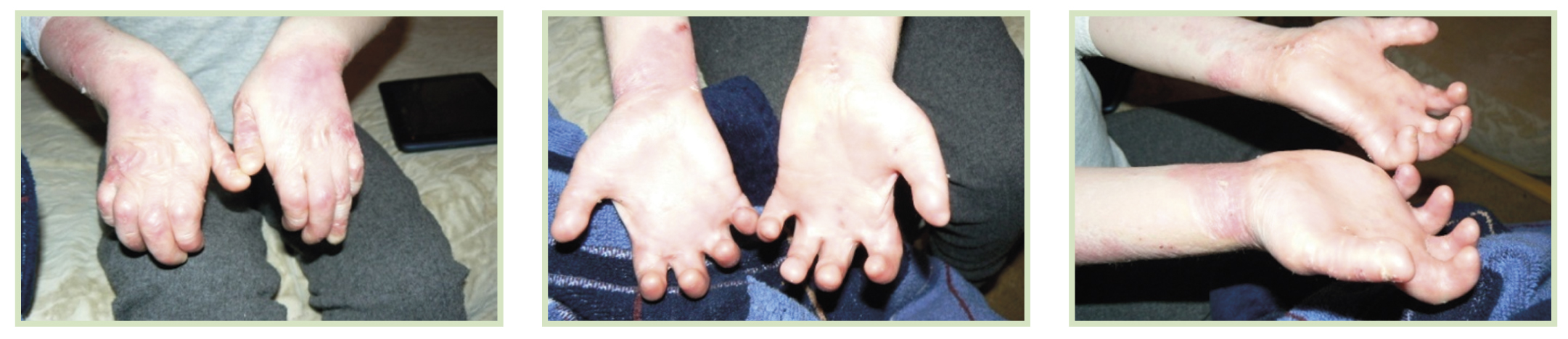 Примечание. Наблюдаются деформация кистей, сгибательные контрактуры пальцев.