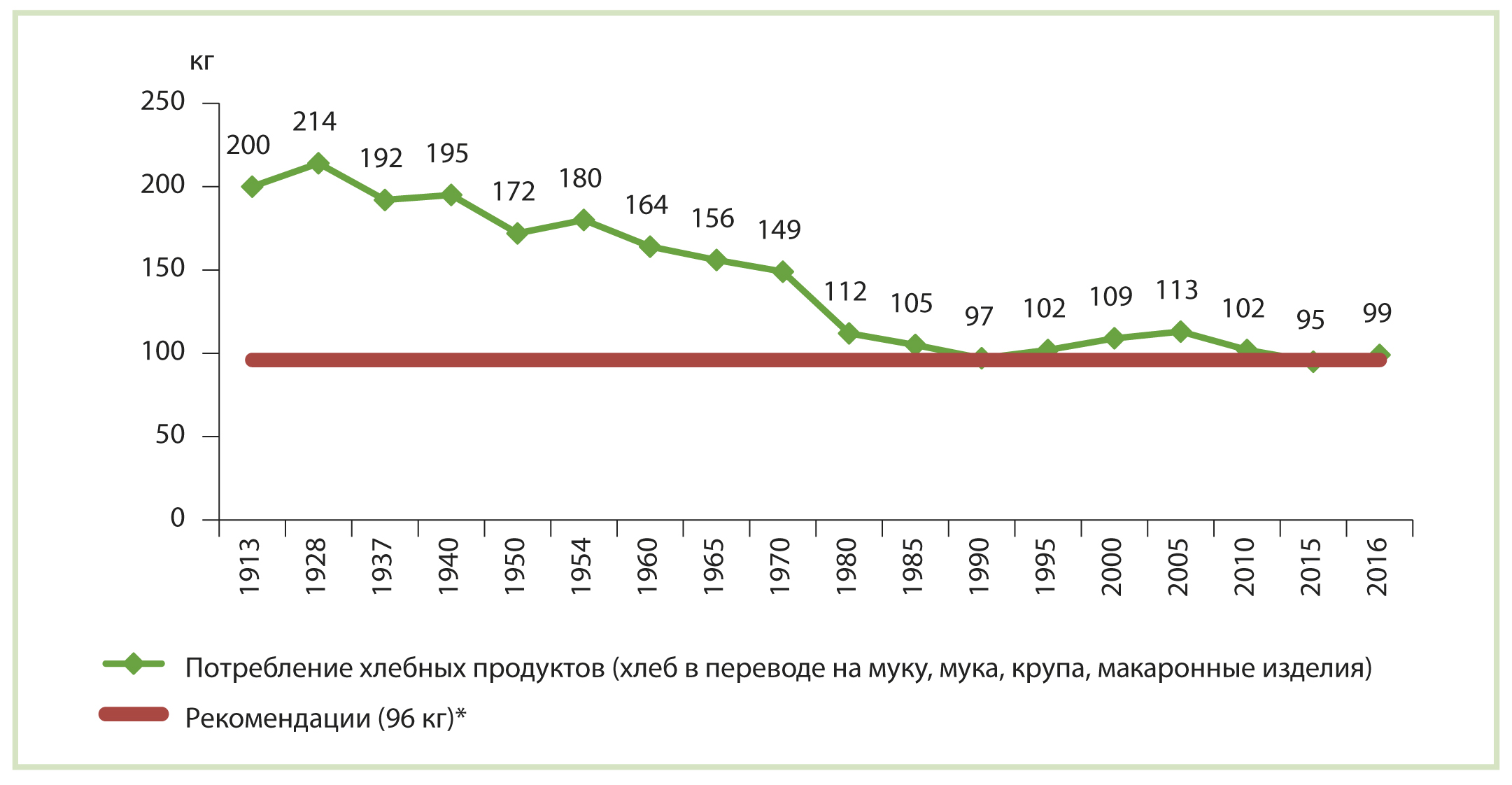 Потребление хлебных продуктов в 1913 г. было выше, по сравнению с современным периодом, в 2 раза и снижалось постепенно (рис. 1). На сегодняшний день уровень потребления 99 кг хлебных продуктов в год на человека соответствует рекомендациям (96 кг), установленным Приказом МЗ РФ № 614 от 19 августа 2016 г., и отвечает современным требованиям здорового питания.