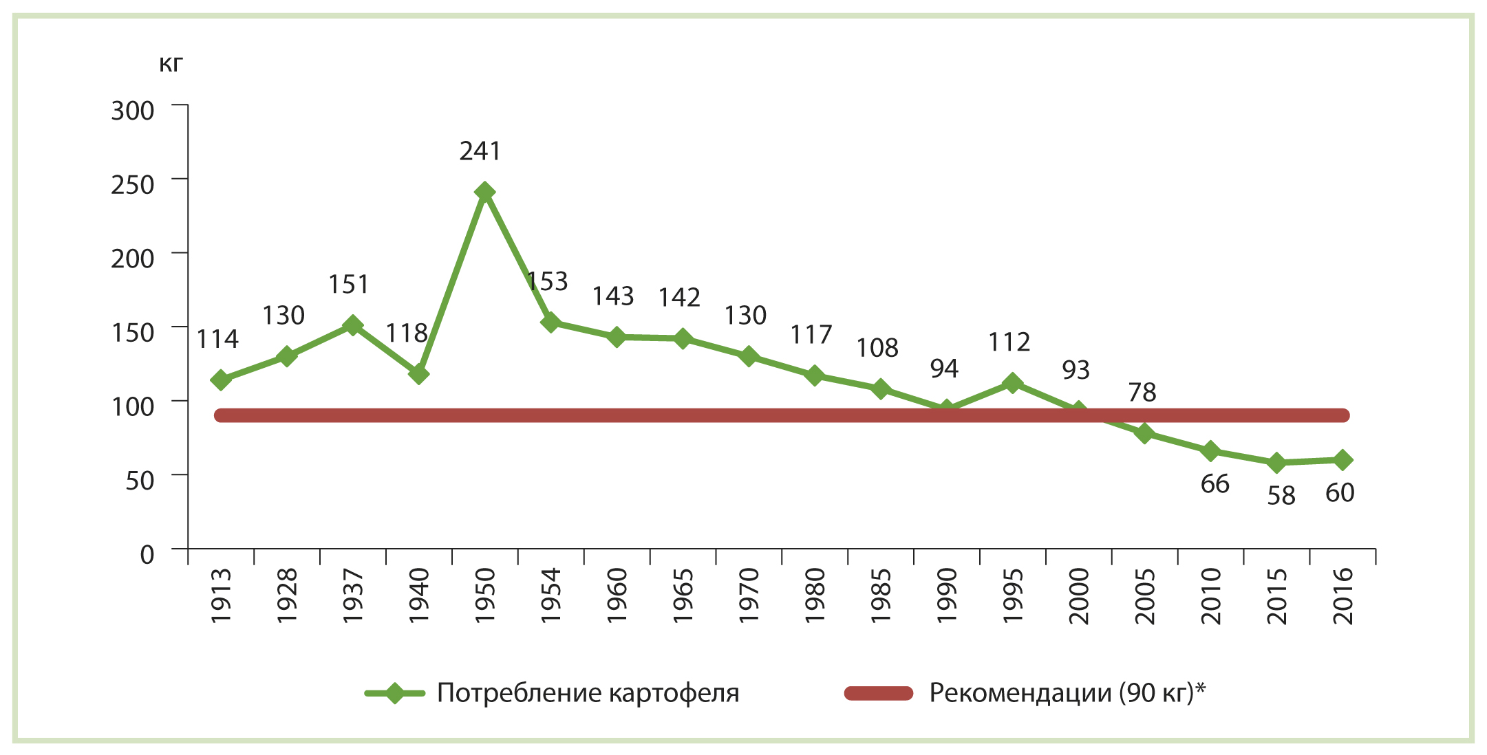 Рис. 2. Потребление картофеля населением России в период с 1913 по 2016 г. (кг/год/человек)