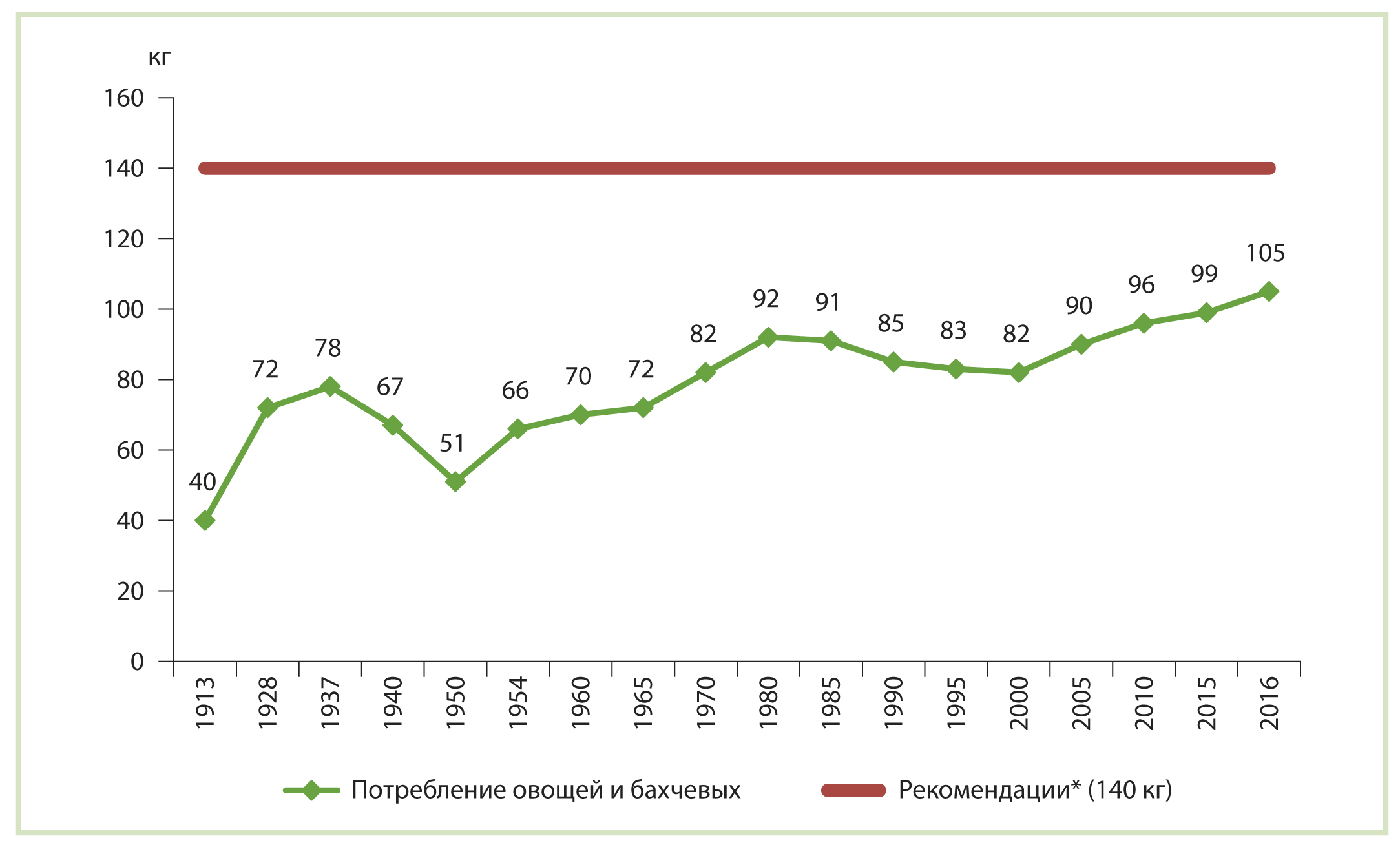 Потребление овощей и бахчевых населением России в дореволюционный период было ниже по сравнению с современным в 2,5 раза. Несмотря на то, что этот показатель постоянно растет, и потреблению овощей уделяется много внимания на всех уровнях здравоохранения, рекомендуемых значений достичь пока не удалось. В 2016 г. уровень потребления овощей и бахчевых составлял 105 кг на человека в год при рекомендованных 140 кг (рис. 3).