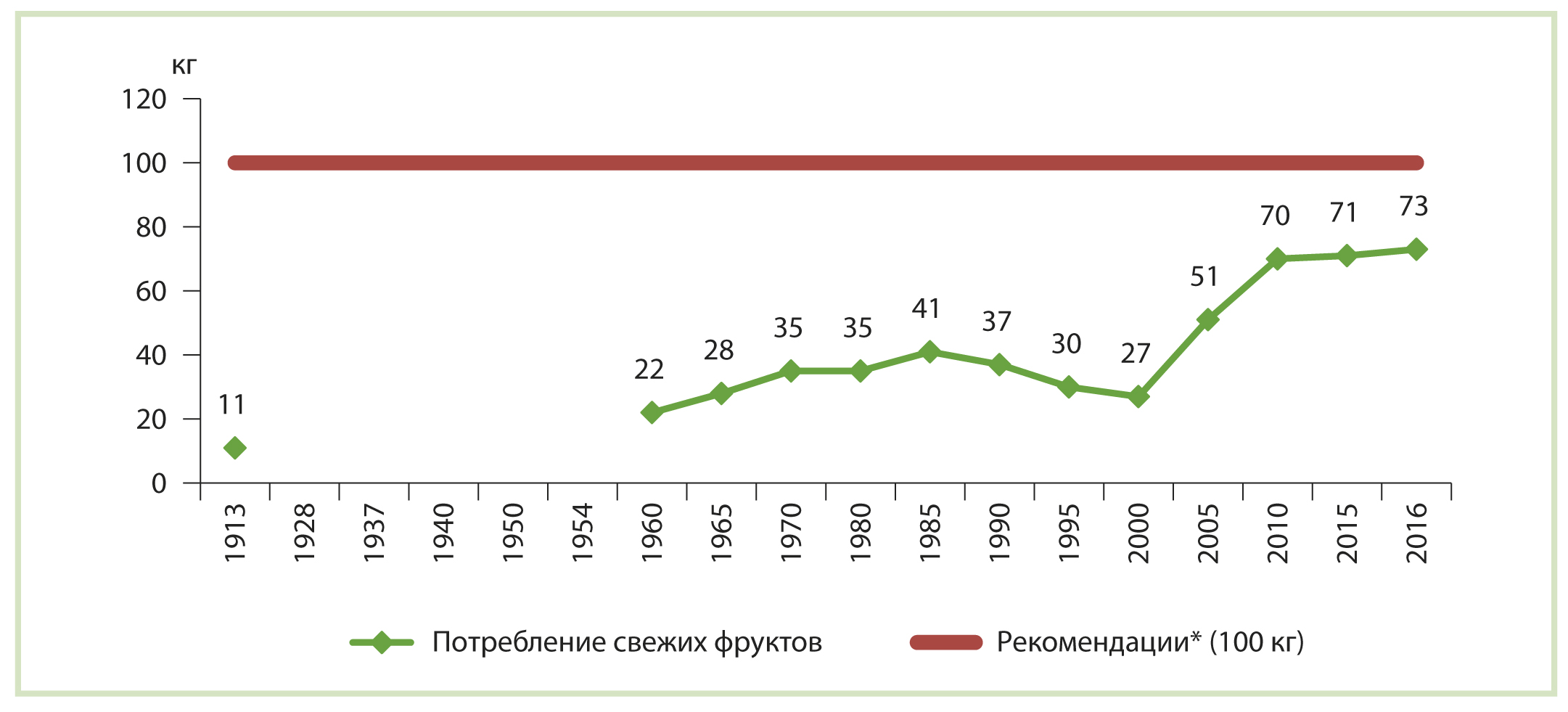 Недостаточное потребление овощей, в том числе картофеля, и, как следствие, недостаточное потребление необходимой организму клетчатки непременно приводит к повышенному потреблению простых углеводов и к перераспределению соотношения белков, жиров и углеводов в рационе человека. Делая выбор в пользу продуктов животного происхождения и простых углеводов вместо овощей, человек тем самым существенно увеличивает калорийность рациона, что приводит не только к увеличению массы тела, но и к изменению соотношения количества жировой и мышечной ткани. Несмотря на то, что уровень потребления фруктов по сравнению с дореволюционным уровнем вырос в 6,5 раз и составил 73 кг на человека в год, целевых показателей 100 кг достичь не удается (рис. 4).