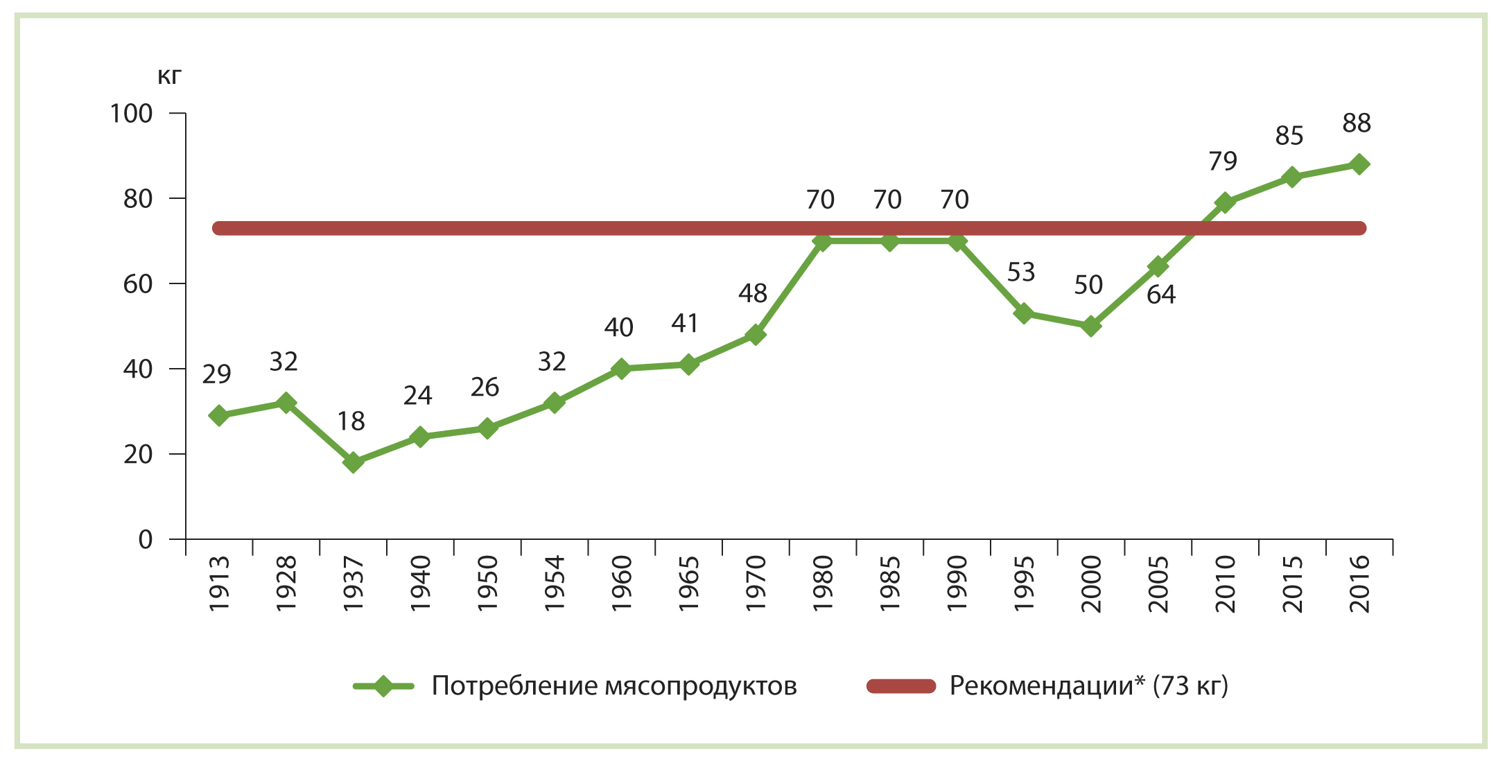 За последние 100 лет отмечается рост потребления мясопродуктов населением России в 3 раза (рис. 5). На графике потребления мясопродуктов можно видеть два спада — по данным за 1937 г. и данным за период с 1995 по 2005 г. Эти спады потребления мясопродуктов совпадают с изменениями социально-экономической ситуации в стране. Начиная с 2010 г. отмечается увеличенное потребление мясопродуктов, и такая тенденция сохраняется до настоящего времени. По данным на 2016 г., избыток потребления мясопродуктов составляет 15 кг на человека в год. Нужно обратить внимание на то, что к группе мясопродуктов относятся в том числе кулинарные (котлеты, пельмени) и колбасные изделия, богатые жирами, с высокой энергетической ценностью, при этом все большее количество домохозяйств делает выбор в пользу тех продуктов, которые не требуют длительного приготовления.