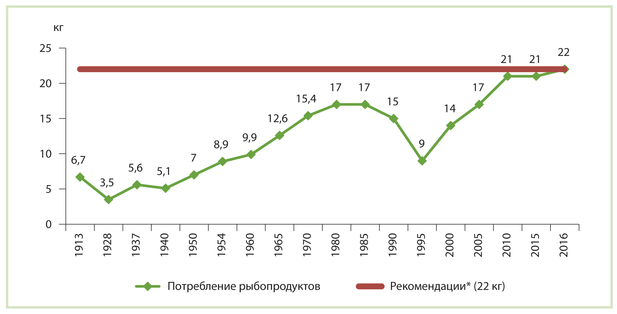 Потребление рыбопродуктов населением России в дореволюционный период было ниже по сравнению с современным более чем в 3 раза. Заметно существенное, так же как и на графике потребления мясопродуктов, снижение объема рациона в период с 1990 по 2000 г., что совпадает с изменениями социально-экономической ситуации в стране. В 2016 г. уровень потребления рыбопродуктов составлял 22 кг на человека в год, что соответствует рекомендованному (рис. 6).
