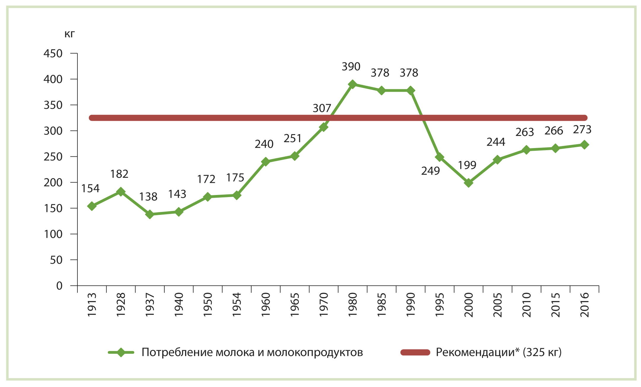 Уровень потребления молока и молокопродуктов населением России длительное время сохранялся на достаточно стабильном уровне. В период с 1970 по 1990 г. отмечалось увеличение потребления, однако с 1995 г. наблюдается резкое снижение, и рекомендованный уровень потребления молока и молокопродуктов, по данным на 2016 г., не достигнут (рис. 7).