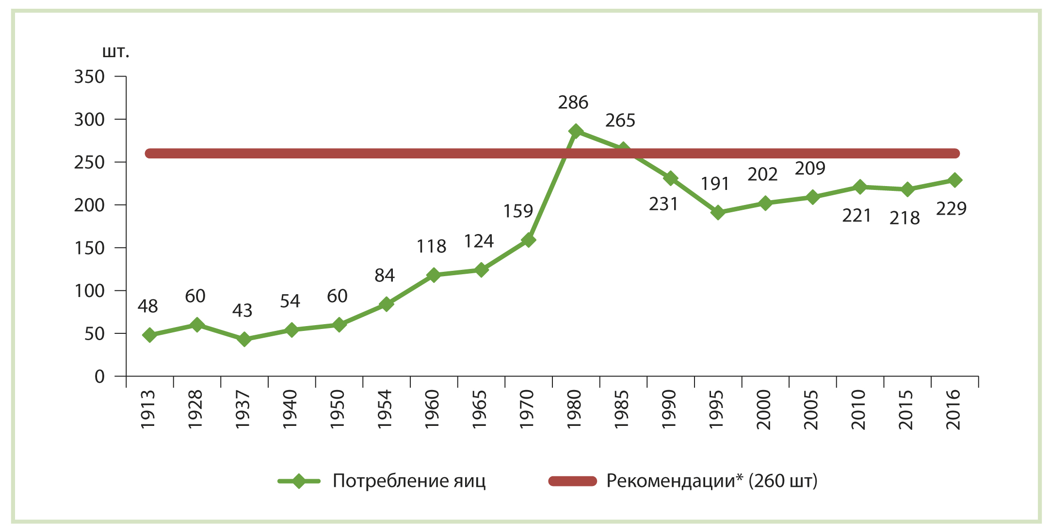 По сравнению с 1913 г. уровень потребления яиц населением России вырос почти в 5 раз. В период с 1980 по 1985 г. отмечался пик, сменившийся спадом потребления яиц. С 1995 г. отмечена слабоположительная тенденция, однако рекомендованный уровень потребления яиц не достигнут. Причинами этого могут быть не только изменения в агропромышленных комплексах, но и активно обсуждаемая тема о влиянии яиц на уровень холестерина в крови человека (рис. 8).