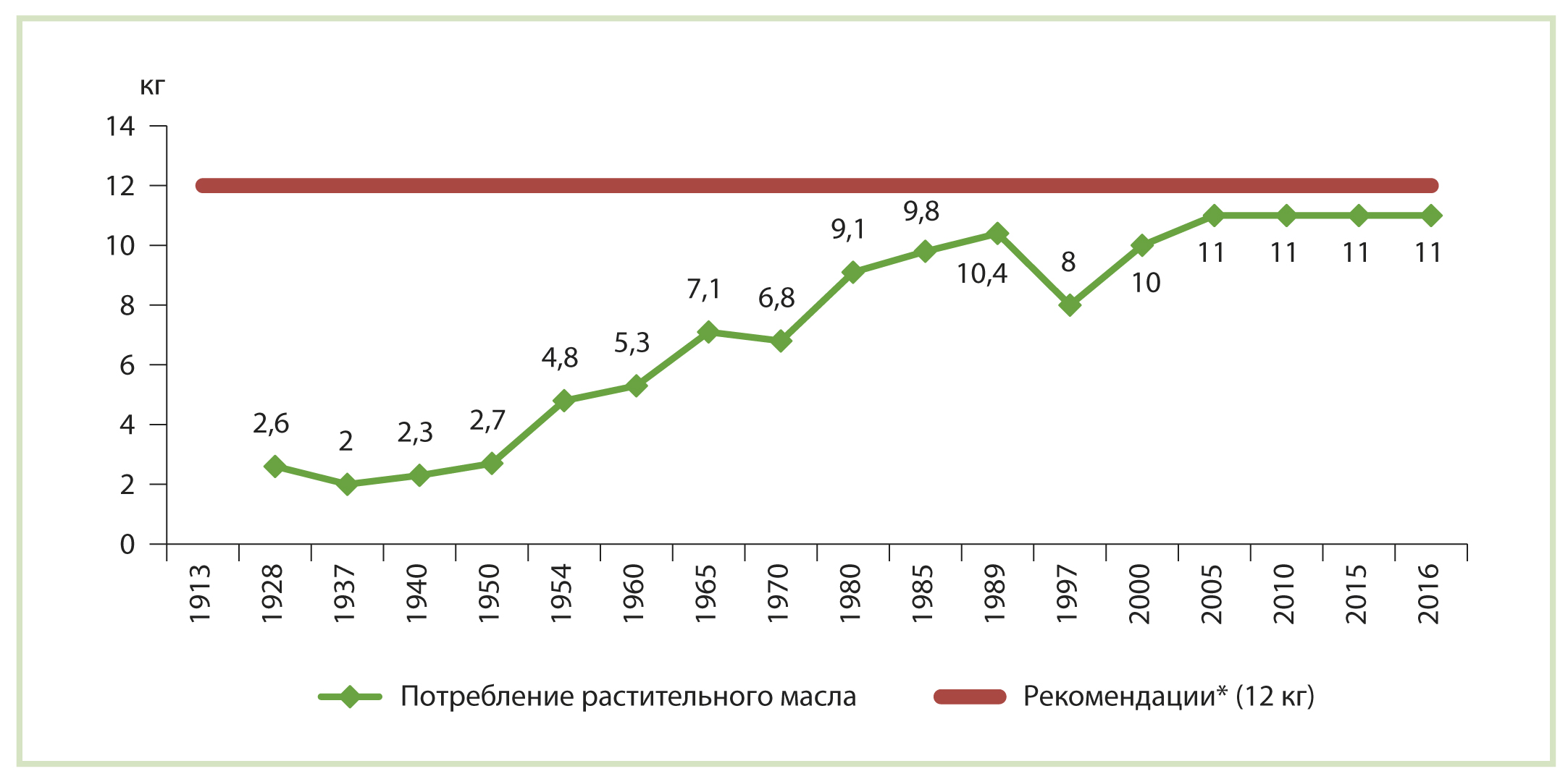 Потребление растительного масла населением России в дореволюционный период было ниже по сравнению с современным более чем в 4 раза. На протяжении последних 10 лет сохранялся стабильный уровень 11 кг на человека в год при рекомендованных 12 кг (рис. 9).