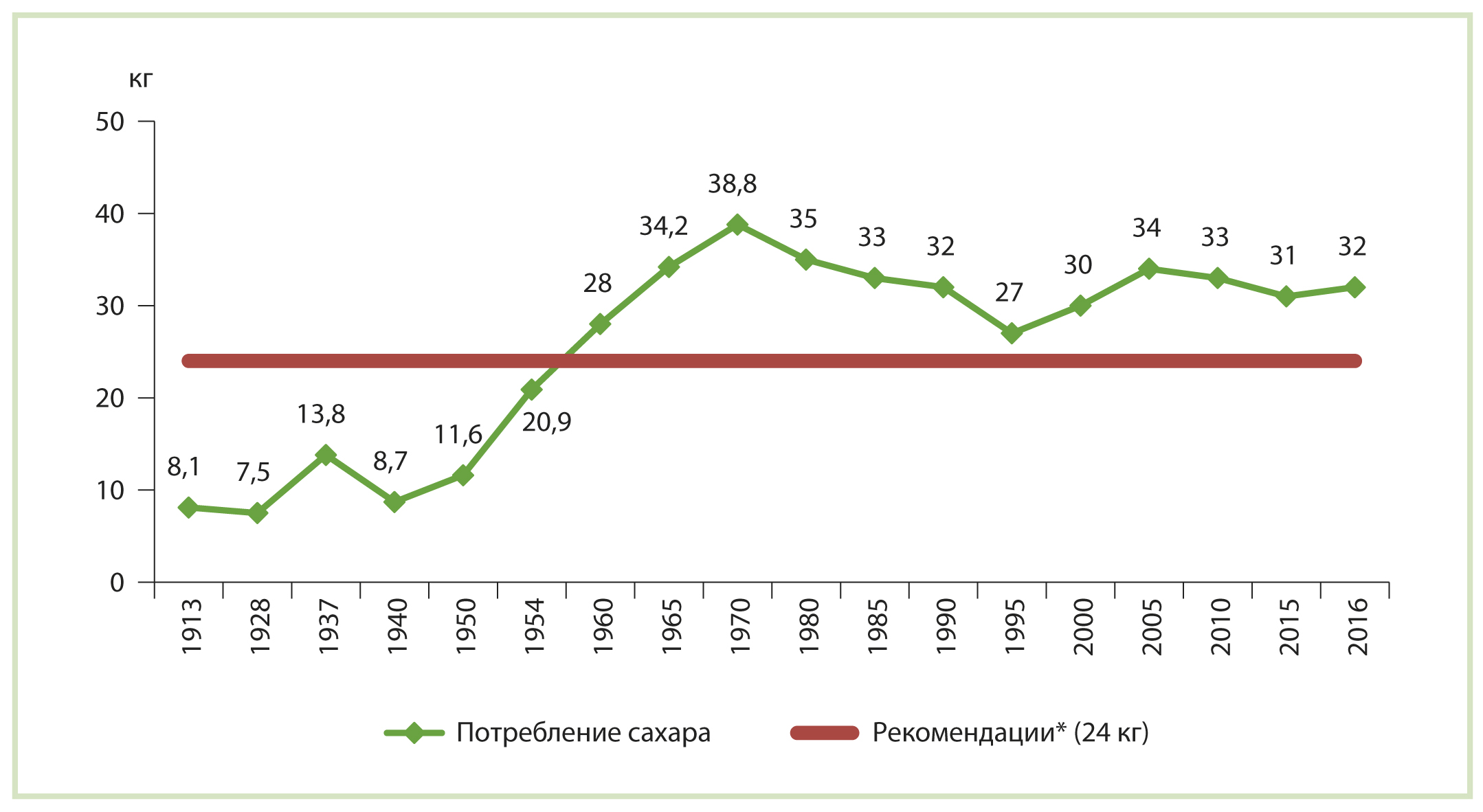 По сравнению с 1913 г. уровень потребления сахара населением России вырос почти в 4 раза. Начиная с 1960 г. этот показатель остается повышенным. Даже в 1995 г. на фоне общего снижения потребления пищевых продуктов уровень потребления сахара был выше рекомендованного на 2 кг. По данным на 2016 г., превышение потребления сахара составляет 8 кг на человека в год (рис. 10).