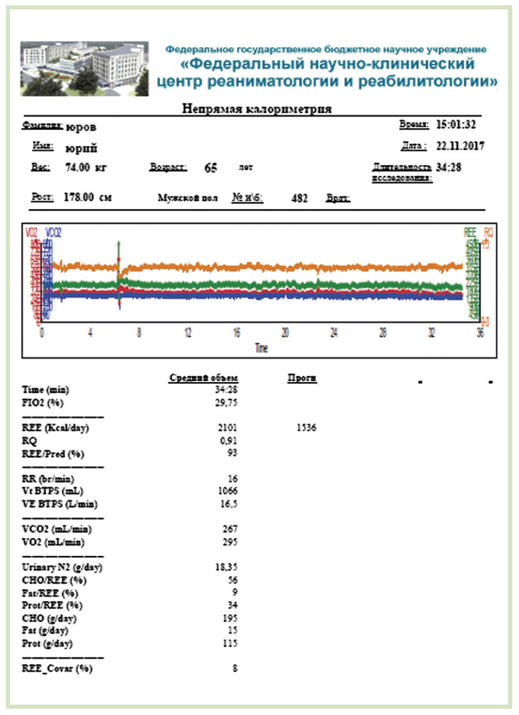 Исследования метаболизма методом непрямой калориметрии проводили на системе анализа газообмена и метаболизма Ultima СPX компании MedGraphics (США). Исследование проводили в течение не менее 30 мин. Непосредственно перед исследованием в интерфейсную программу прибора вносили основные данные пациента. После окончания исследования интерфейсная программа производила автоматический пересчет показателей, полученных датчиками, и формировала отчет, в котором указывались величина энергетических затрат покоя, респираторный коэффициент и данные о коэффициенте вариабельности (рис. 2).