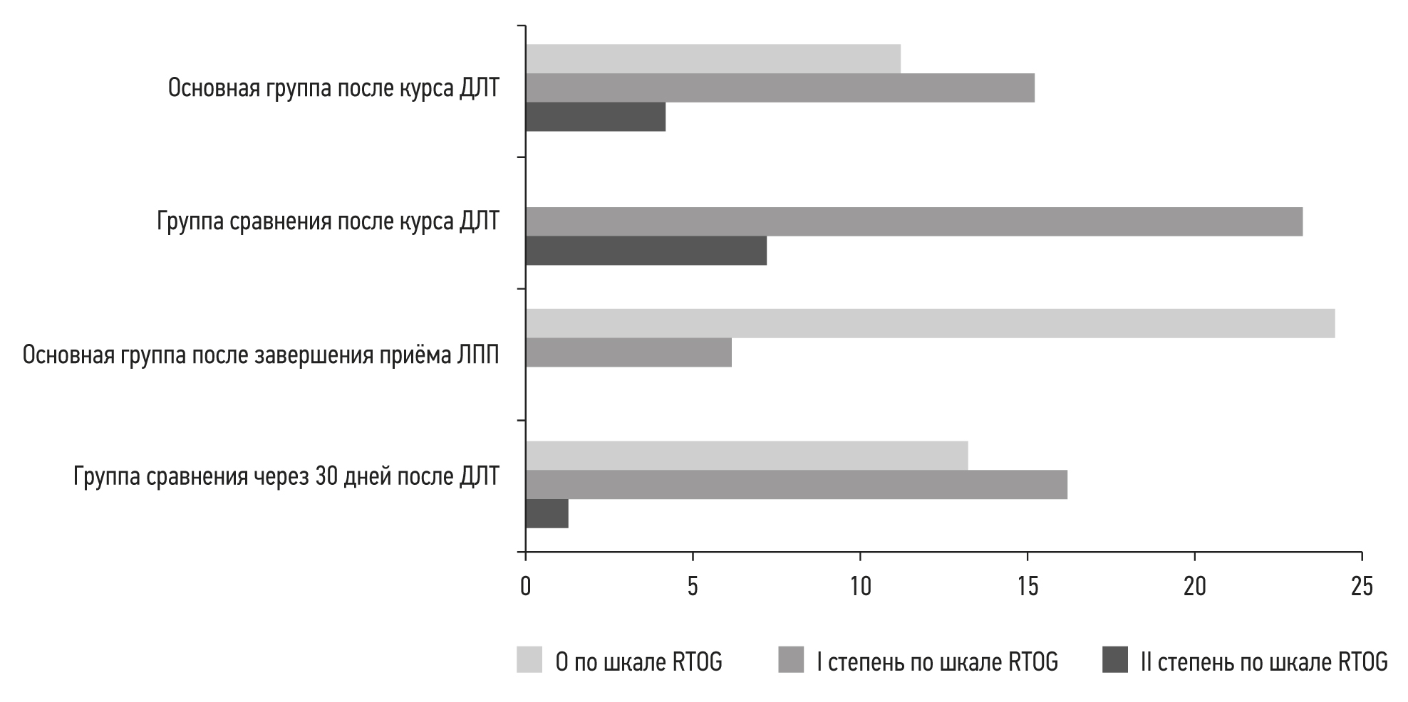 Рис. 1. Динамика выраженности лучевых реакций по шкале RTOG (Radiation Therapy Oncology Group). ДЛТ — дистанционная лучевая терапия; ЛПП — пищевой продукт диетического лечебного и профилактического питания.