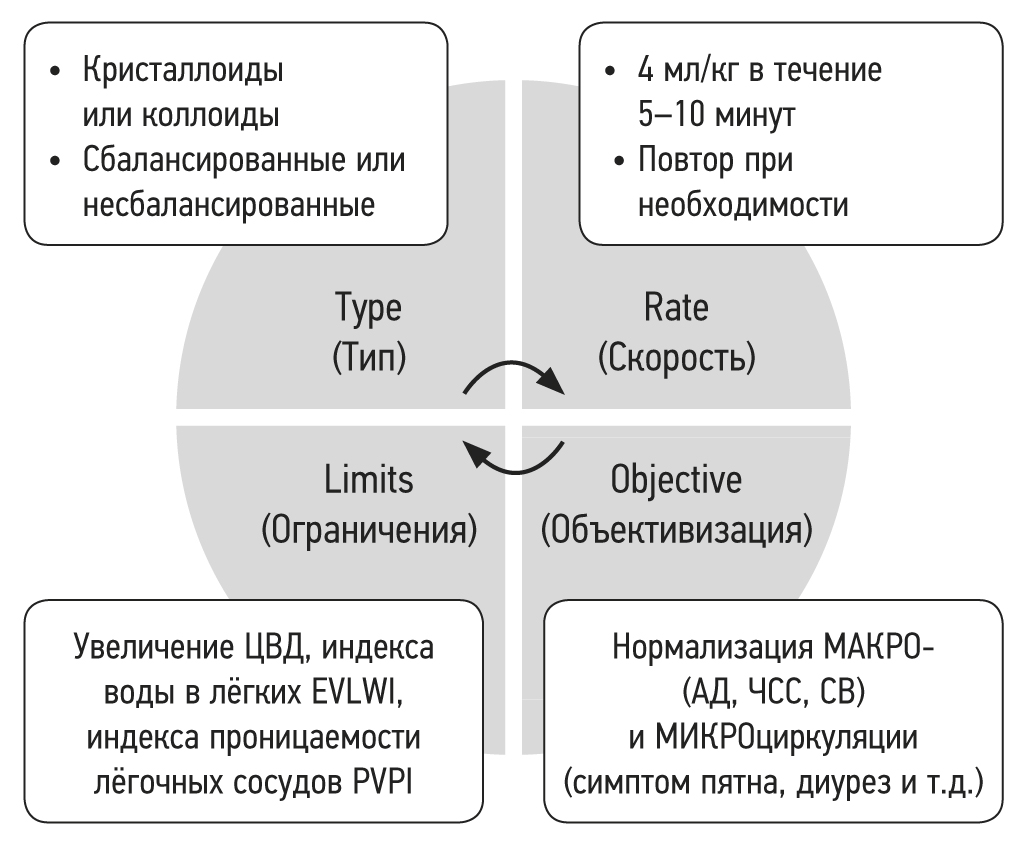 Фаза оптимизации (счёт на часы). Цель оптимизации и поддержания адекватной перфузии тканей и оксигенации — предотвращение повреждения органов и, как следствие, развития полиорганной недостаточности. К этому времени уже должна осуществляться определённая форма мониторинга (зависит от тяжести клинической ситуации и от возможностей учреждения). ИТ проводят в соответствии с индивидуальными потребностями и регулярно переоценивают вводные данные, например, с использованием методов «нагрузки жидкостью» [17, 21]. ИТ следует проводить осторожно, принимая во внимание четыре основных компонента TROL (type, rate, objective, limits) (рис. 1) [17]: тип жидкости, скорость введения раствора, объективизация (например, нормальное артериальное давление или частота сердечных сокращений) и ограничения (например, высокий уровень центрального венозного давления).