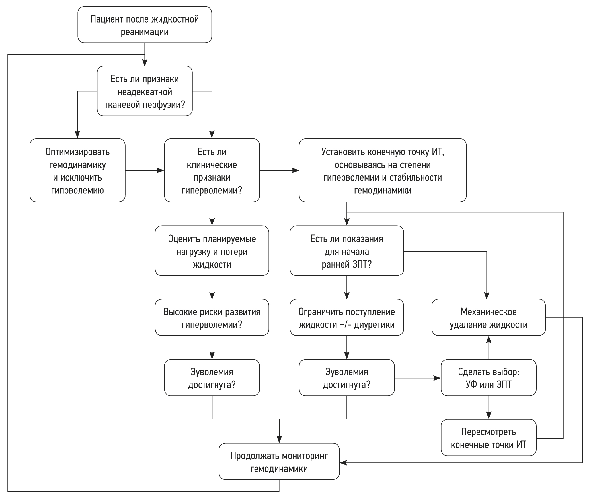 Внутривенное введение жидкости следует рассматривать как любое другое фармакологическое воздействие. Среди кристаллоидов сбалансированные растворы более предпочтительны, т.к. ограничивают кислотно-щелочные изменения и хлоридную нагрузку и вероятно, предотвращают почечную дисфункцию. Среди коллоидов альбумин — единственный доступный природный коллоид, который может (по современным данным) оказывать положительный эффект на исходы заболеваний. В последнее десятилетие наблюдается растущий интерес к потенциальному вреду, связанному с перегрузкой жидкостью. В периоперационных условиях соответствующее управление ИТ, которое поддерживает адекватную перфузию органа при одновременном ограничении введения жидкости, должно представлять собой стандарт лечения. Аналогичный подход следует рассматривать и для тяжелобольных пациентов, у которых повышенная эндотелиальная проницаемость делает эту стратегию более актуальной. Активные протоколы деэскалации могут потребоваться на более позднем этапе. Концептуальная модель R.O.S.E. (Реанимация, Оптимизация, Стабилизация, Эвакуация) точно обобщает динамический подход к флюидной терапии, максимизируя преимущества и минимизируя вред.