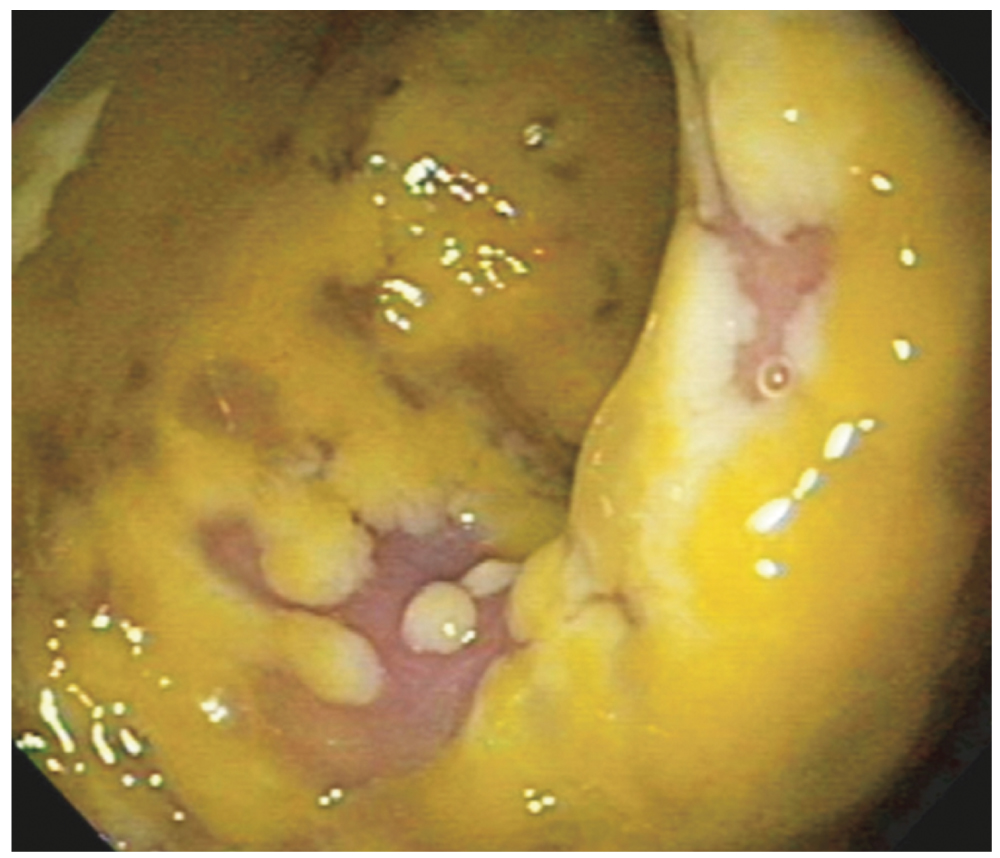 Fig. 1. Endoscopic picture of pseudomembranes on the surface of the mucous membrane of the large intestine (open source).