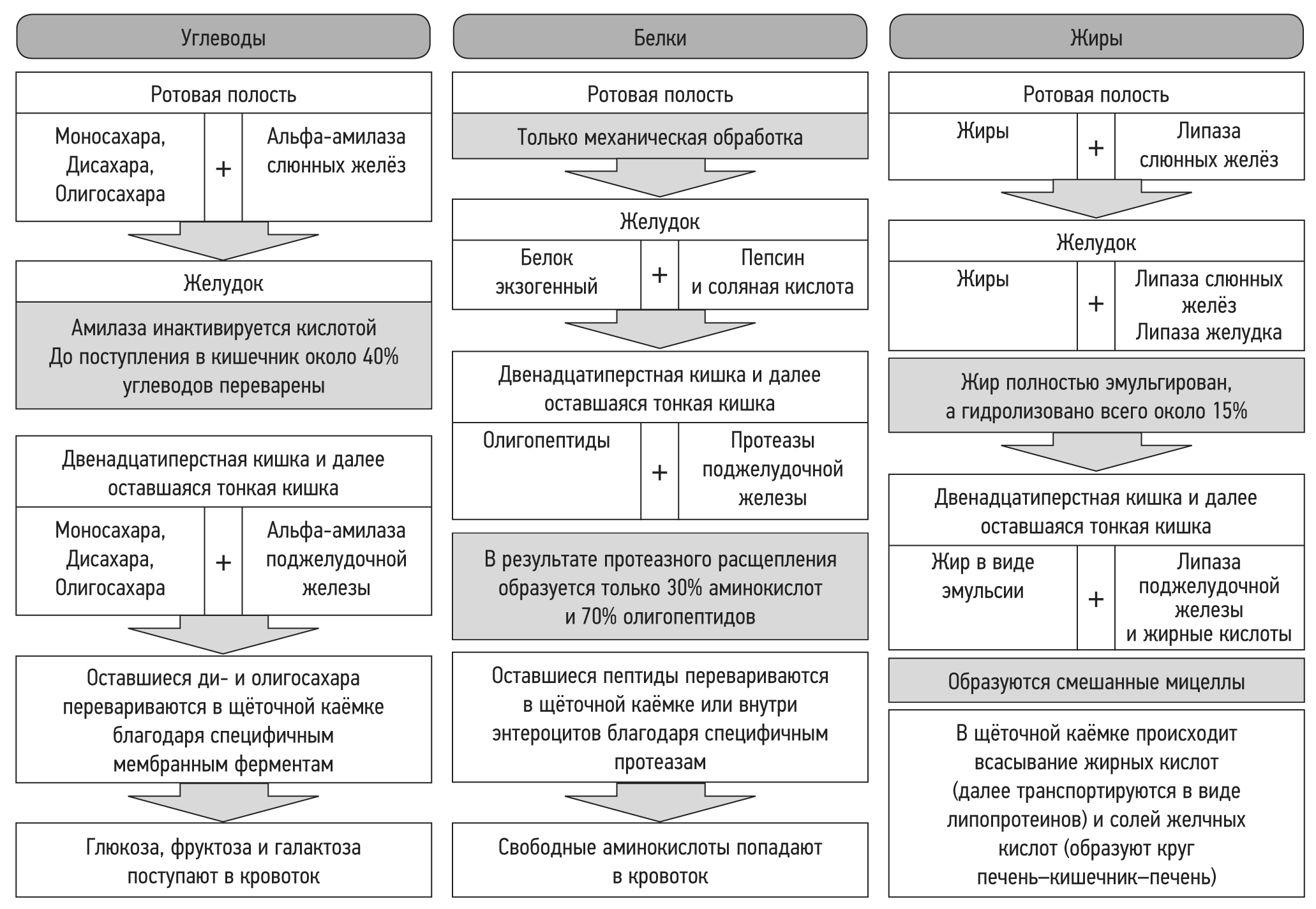 Эмульгирование жиров начинается уже при приготовлении пищи и механическом её пережёвывании, а заканчивается в желудке взбиванием перистальтикой. Гидролиз жиров начинается в ротовой полости под действием липазы, вырабатываемой слюнными железами, и продолжается в желудке под действием липазы, вырабатываемой главными клетками слизистой оболочки. В результате этих процессов переваривается только 15% жиров. Капли эмульсии, поступающие из желудка, представляют собой сферы, в ядре которых находятся триглицериды и диглицериды, а оболочка состоит из полярных липидов, фосфолипидов, холестерина и т.д. В двенадцатиперстной кишке под действием панкреатической липазы и желчных кислот образуются смешанные мицеллы — это растворимые комплексы, обеспечивающие переход продуктов гидролиза (солей желчных кислот и смешанных липидов, таких как жирные кислоты, моноглицериды, лизофосфолипиды и холестерин) в энтероциты через нетронутый слой воды, омывающий щёточные мембраны. Там жирные кислоты протонируются и покидают смешанные мицеллы, чтобы либо диффундировать через липидные мембраны, либо временно превратиться в липиды клеточной стенки. Соли желчных кислот из смешанных мицелл остаются в просвете кишечника и позже всасываются в подвздошной кишке, с кровотоком попадая в печень, а потом снова секретируются, поступая в желчь. Транспортной формой жиров являются липопротеины, которые синтезируются в тонкой кишке или печени и доставляют липидные компоненты в ткани организма (см. рис. 1) [6].