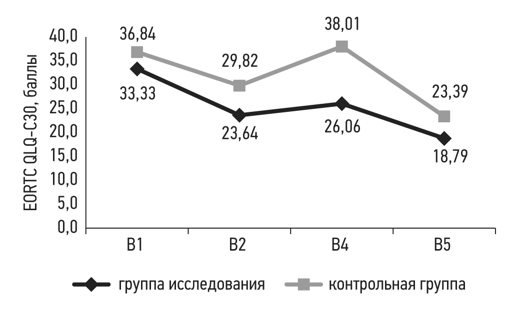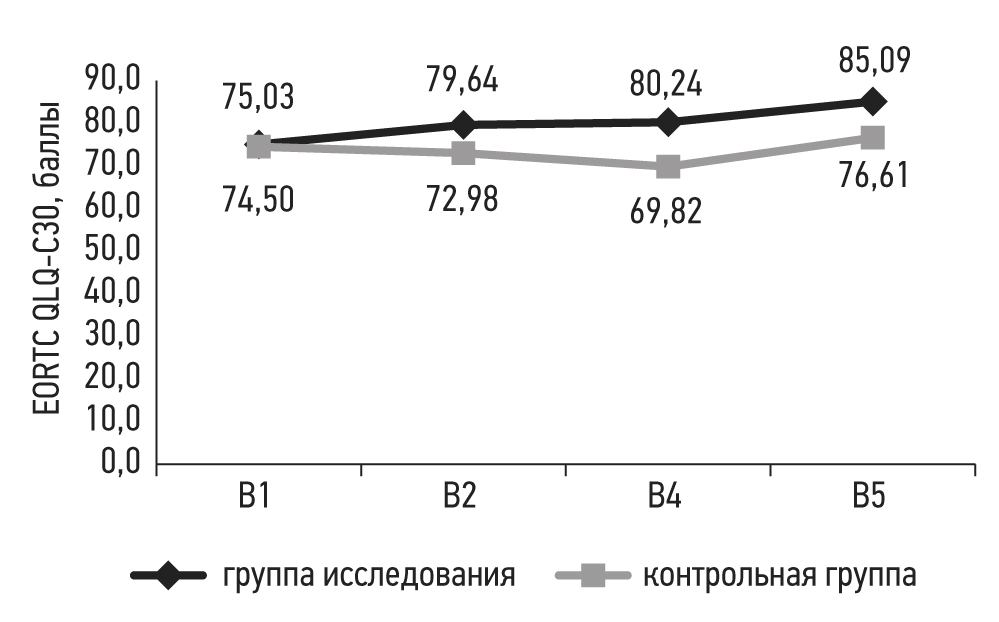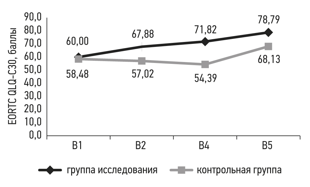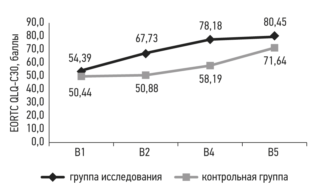 Качество жизни пациентов в исследовании NUTRILUNC оценивали по основному опроснику Европейской организации по исследованию и лечению рака — Quality of Life Questionnaire Core-30 (EORTC QLQ-C30, «Опросник качества жизни») [8]. Оценку проводили на 4 этапах исследования (на этапе В3 больные не анкетировались, поскольку этот этап выпадал на 3-и послеоперационные сутки, и достоверная оценка качества жизни была невозможна):