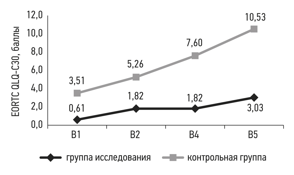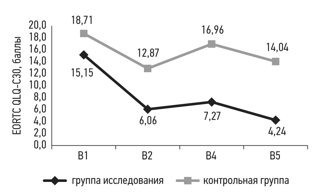 Несмотря на то, что пациенты в ГИ в течение всего периода наблюдений имели более высокие растущие показатели эмоционального, когнитивного и социального функционирования по сравнению с пациентами КГ, динамика этих показателей не показала значимых отличий между группами. Возможно, это объясняется состоянием тревоги и депрессии, характерного для популяции онкологических больных в целом и для больных НМРЛ в частности [18, 19]. Медленное улучшение этих параметров, возможно, говорит о тяжести психологического дистресса, характерного для данной когорты пациентов, и инертности этих факторов, зависящих от многих причин.