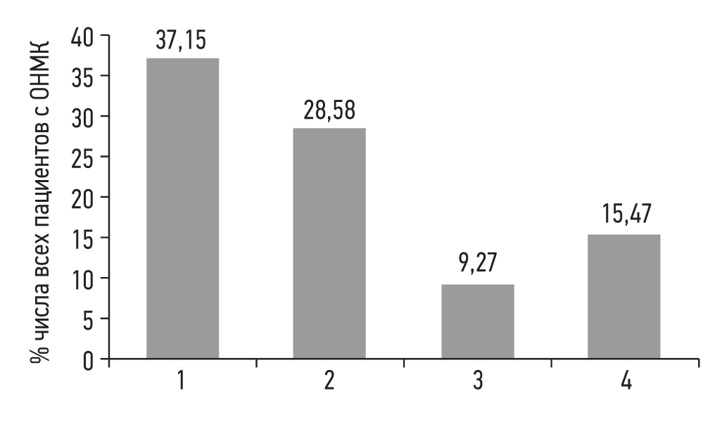 Fig. 1. Distribution of patients depending on the signs of protein-energy malnutrition: 1 — the proportion of patients with signs of protein-energy malnutrition; 2 — the proportion of patients with hypoproteinemia, hypoalbuminemia; 3 — the proportion of patients with a decrease of body weight more than 10%; 4 — the proportion of patients with bedsores. ОНМК — аcute cerebrovascular accident.