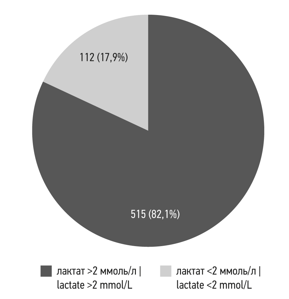 Из 11 647 госпитализированных пациентов сепсис впоследствии был диагностирован у 627 (5,4%) пациентов, среди которых исходная гиперлактатемия была выявлена у 515, что составило 82,1% (рис. 1).