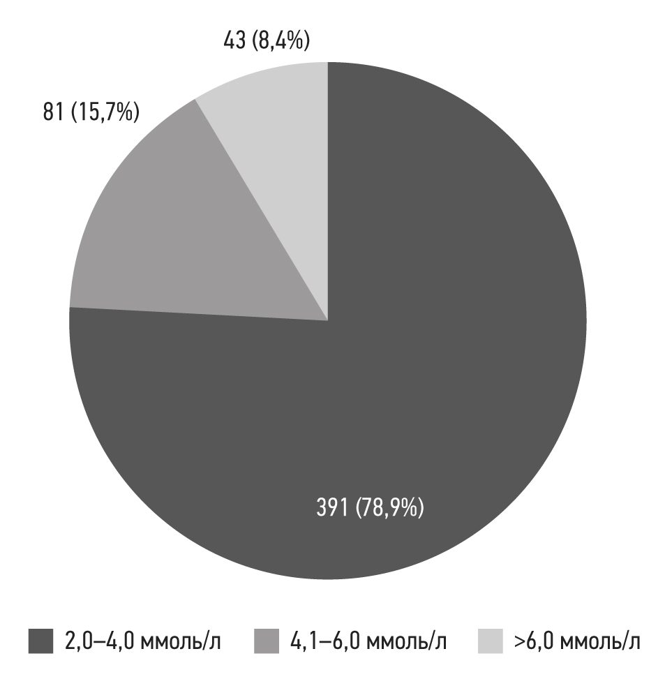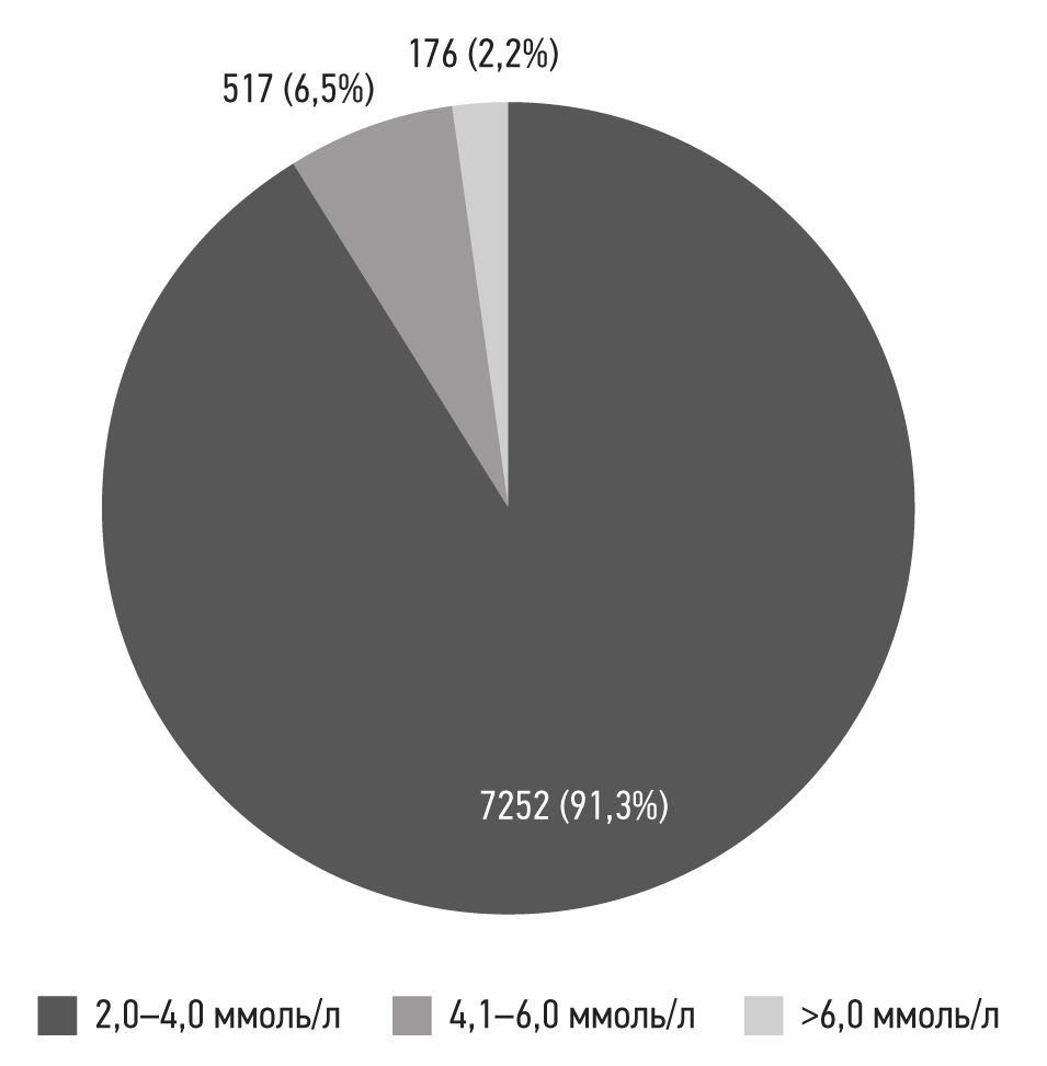 Исходно гиперлактатемия выявлена у 7945 пациентов, что составило 68,2% общего числа вошедших в исследование (рис. 2). Распределение участников исследования по степени гиперлактатемии на момент госпитализации представлено на рис. 3, распределение по содержанию лактата среди этих пациентов — на рис. 4.