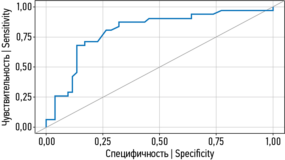 Площадь под ROC-кривой составила 0,803±0,070, 95% доверительный интервал (ДИ) 0,666–0,940. Полученная модель была статистически значимой (p <0,001).