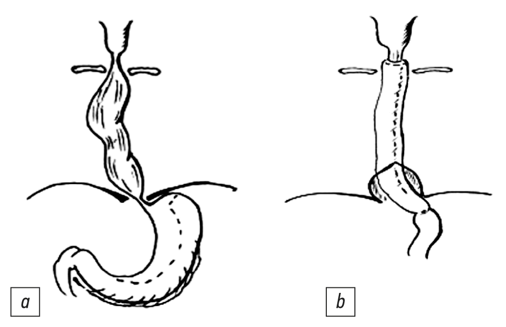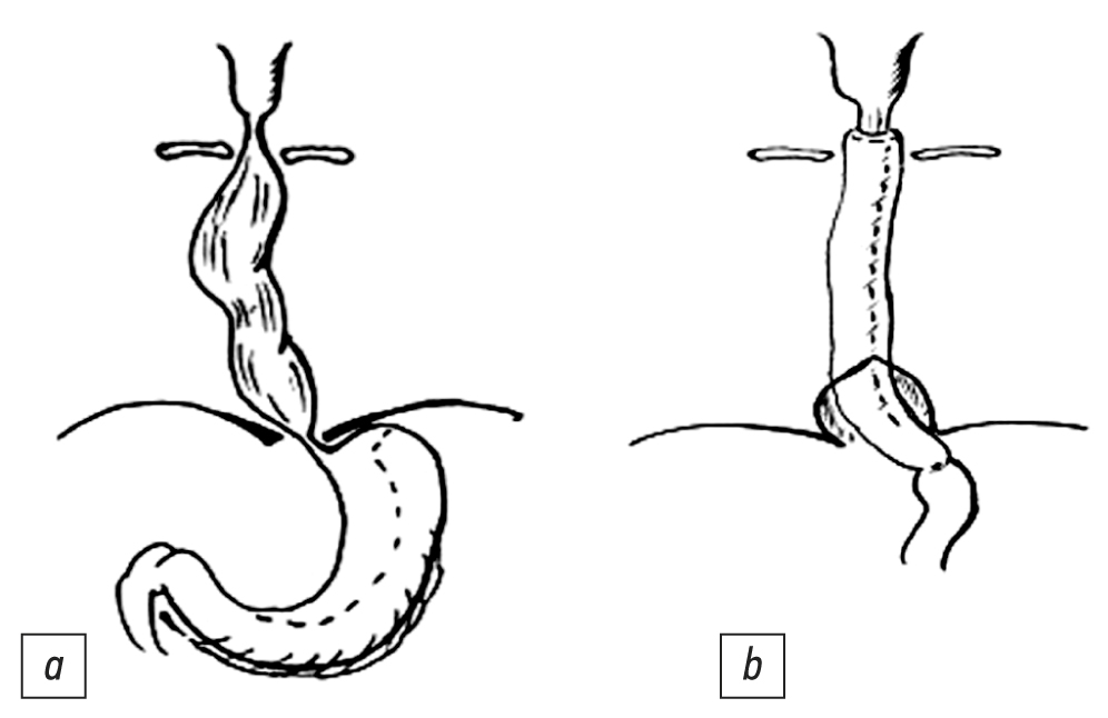 Рис. 1. Схема оперативного вмешательства: эзофагэктомия, субтотальная пластика пищевода изоперистальтической желудочной трубкой: а ― до операции, b ― после операции.