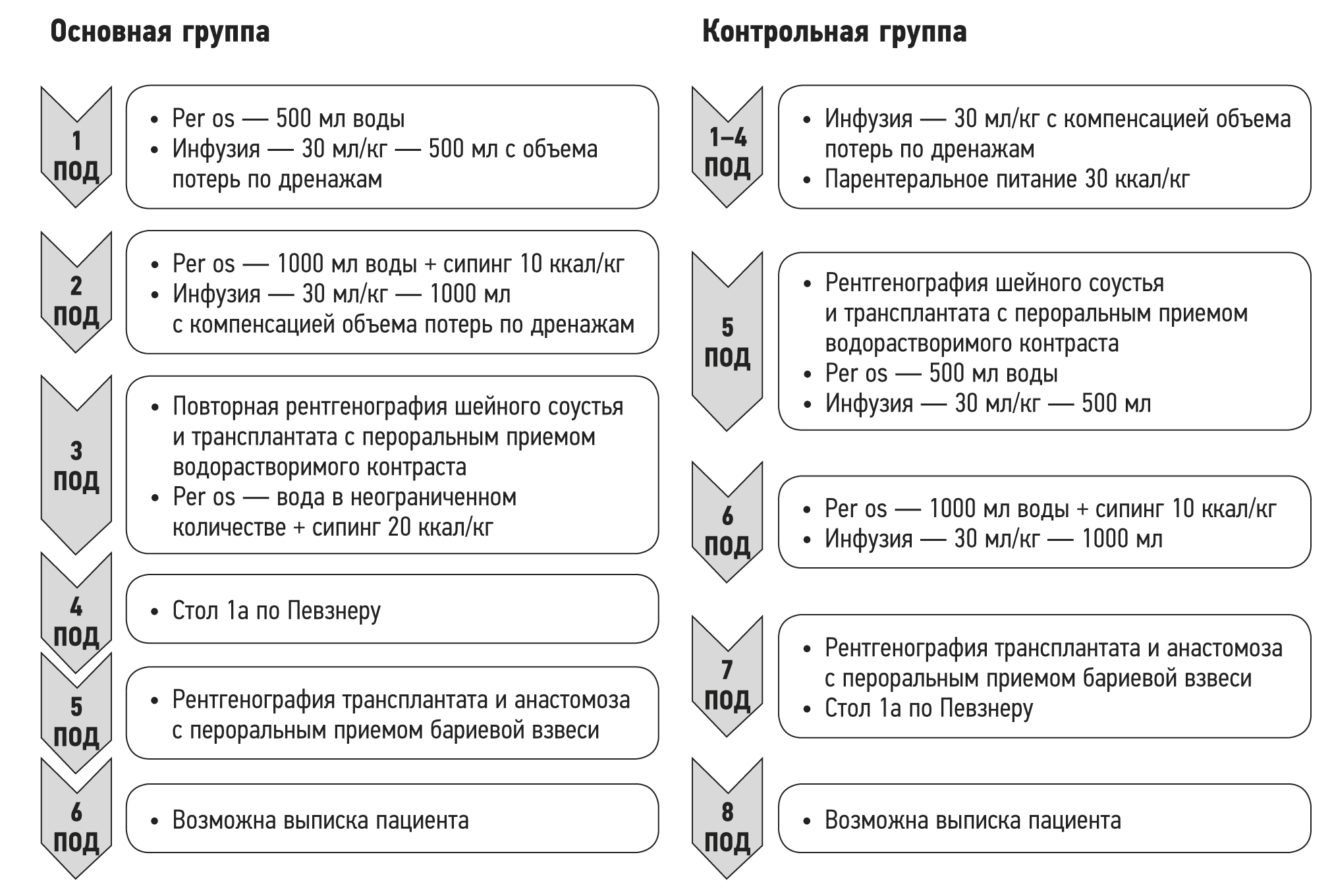 Рис. 2. Протокол послеоперационной нутритивной поддержки пациентов основной и контрольной групп.Примечание. ПОД ― послеоперационный день.