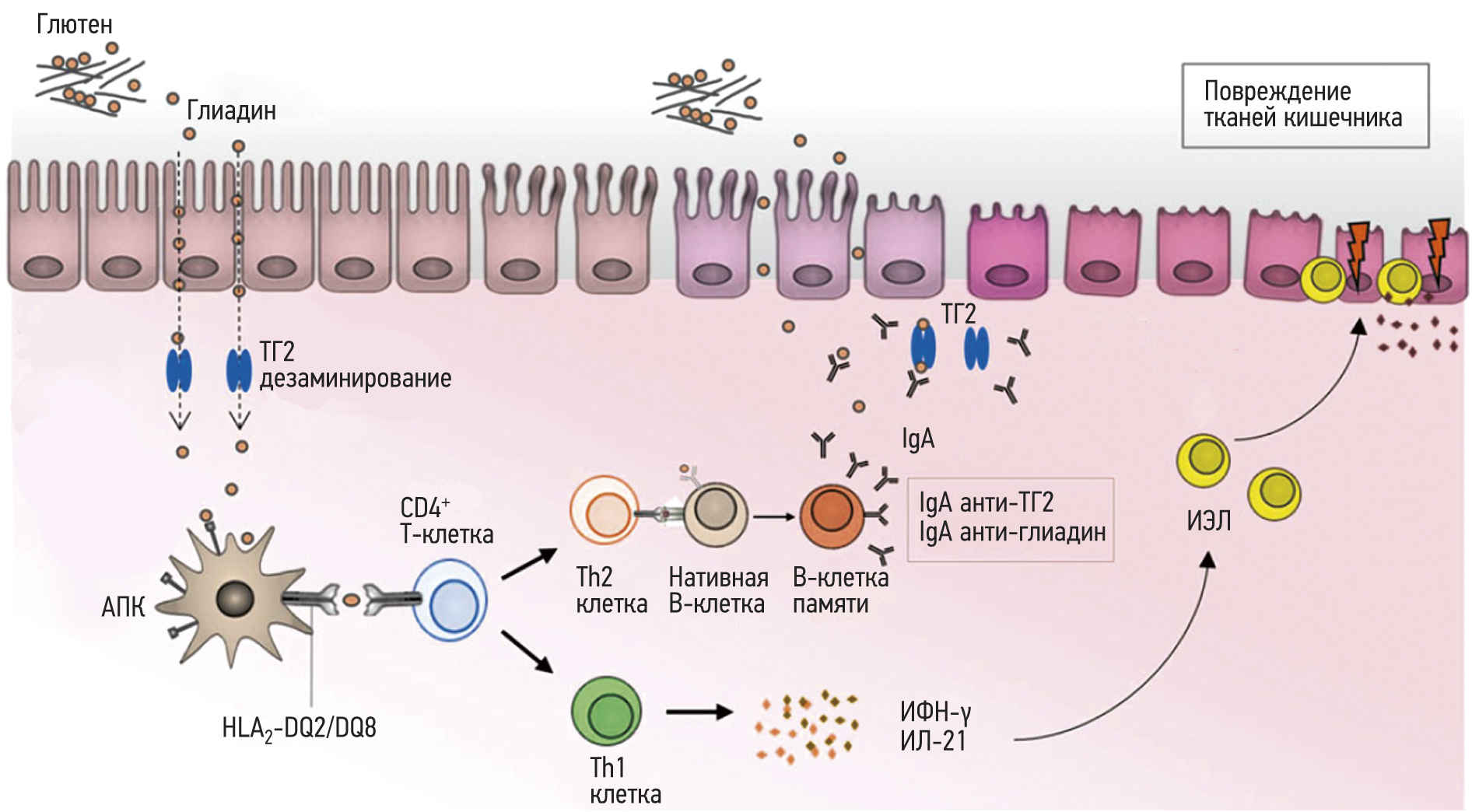 Рис. 1. Патогенез целиакии: после дезаминирования глютеновых пептидов происходит процесс антигенной презентации. HLA2-DQ2/DQ8 антигенпрезентирующих клеток (АПК) представляют данные пептиды CD4+ T-клеткам, которые в свою очередь запускают иммунный ответ. С одной стороны, происходит активация Th1-клеток с продукцией большого количества цитокинов (ИФН-γ, ИЛ-21), что способствует повреждению тканей за счёт стимуляции интраэпителиальных лимфоцитов (ИЭЛ). Помимо этого, CD4+ T-клетки также индуцируют ответ Th2 и способствуют клональной экспансии В-клеток и продукции антител IgA против TG2 и глиадина. / Fig. 1. Pathogenesis of celiac disease. After deamination of gluten peptides process of antigen-presentatiom begins. HLA2-DQ2/DQ8 in antigen presenting cells (APC) present this peptides to CD4+ T-cells which are key in the initiation of the inflammatory response. On one hand, they promote a Th1 response in which large amounts of IFN-γ and IL-21 are produced contributing to the activation of Intestinal intraepithelial lymphocytes (IELS). CD4+ T-cells also induce a Th2 response and promote the clonal expansion of B-cells and production of IgA antibodies against TG2 and gliadin.