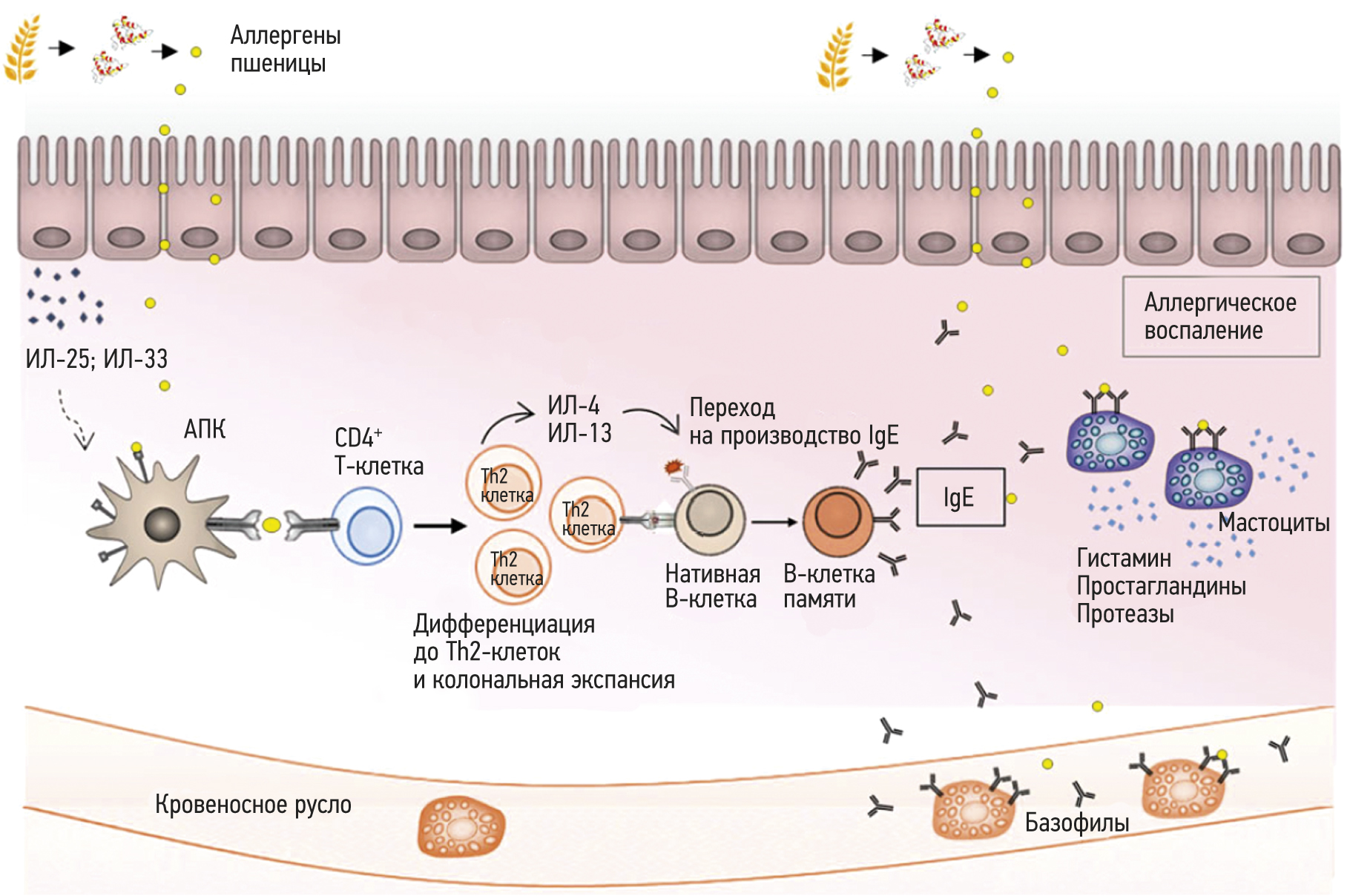 Сходство между целиакией и аллергической реакцией на пшеницу (АНП) заключается в том, что в обоих случаях возникает иммунный ответ при употреблении белков пшеницы. Однако в основе АНП лежит IgE-опосредованная реакция, которая не всегда возникает на белки похожих злаков, как, например, ячменя или ржи [36]. Начальным этапом формирования АНП является взаимодействие белков пшеницы в качестве антигена с антигенпрезентирующими клетками. После презентации происходит формирование Th2-клеток, выделение провоспалительных факторов ИЛ-3 и ИЛ-13, в результате чего активируется процесс пролиферации и дифференцировки В-лимфоцитов, стимулируется выработка IgE. При повторном взаимодействии с аллергеном IgE связываются со своим рецептором FceRI, расположенным на базофилах и плазматических клетках, после чего происходят активация воспалительных и вазоактивных медиаторов и развитие воспаления, распространение которого может ограничиваться как местной реакцией, так и приводить к тяжёлому системному ответу. Данный механизм развития АНП представлен на рис. 2.