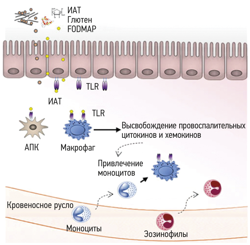 Рис. 3. Предполагаемый механизм развития нецелиакийной чувствительности к глютену. В основе патогенеза, наиболее вероятно, лежат реакции врождённого иммунитета за счёт активации TLR-рецепторов иммунных клеток. Помимо влияния глютена, также предположительную роль в развитии нецелиакийной чувствительности к глютену играют ингибиторы амилазы и трипсина (ИАТ), ферментируемые олиго-, моно-, дисахариды, полиолы (FODMAP), которые также могут активировать дендритные клетки и макрофаги через TLR4. Данное взаимодействие приводит к выбросу провоспалительных цитокинов и хемокинов, инфильтрации тканей эозинофилами, однако не приводит к повреждению слизистой оболочки кишечника. АПК ― антигенпрезентирующая клетка. / Fig. 3. Possible mechanism of nonceliac gluten sensitivity. The pathogenesis is expected to be based on innate immune responses due to the activation of TLR receptors of immune cells. In addition to the influence of gluten, amylase and trypsin inhibitors (ATIs), fermentable oligo-, mono-, disaccharides, polyols (FODMAPs) can also activate dendritic cells and macrophages through TLR4 and play a potential role in the development of non-celiac gluten sensitivity. This interaction results in the release of pro-inflammatory cytokines and chemokines, infiltration of tissues by eosinophils, but does not lead to damage to the intestinal mucosa. АПК ― antigen presenting cells.
