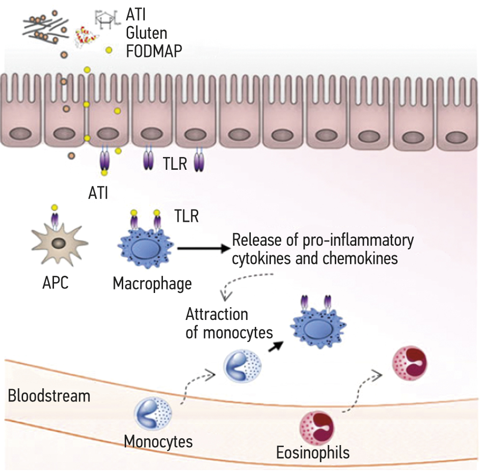 Fig. 3. Possible mechanism of nonceliac gluten sensitivity. The pathogenesis is expected to be based on innate immune responses due to the activation of TLR receptors of immune cells. In addition to the influence of gluten, amylase and trypsin inhibitors (ATIs), fermentable oligo-, mono-, disaccharides, polyols (FODMAPs) can also activate dendritic cells and macrophages through TLR4 and play a potential role in the development of non-celiac gluten sensitivity. This interaction results in the release of pro-inflammatory cytokines and chemokines, infiltration of tissues by eosinophils, but does not lead to damage to the intestinal mucosa. АПК ― antigen presenting cells.