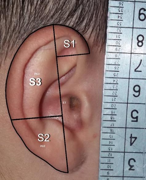 - S2 – сектор, ограниченный перпендикуляром к БЛ от заднего края УР на уровне козелка, отрезком БЛ от этого перпендикуляра к нижней точке мочки уха и наружным краем УР между этими отрезками;