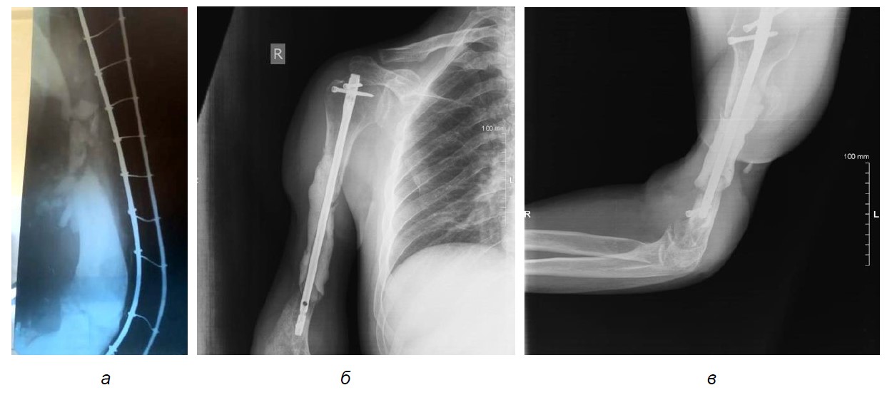 Пациент в результате минно-взрывной травмы получил многооскольчатый открытый перелом средней трети правой плечевой кости с дефектом костной ткани, наличием сквозной раны с размозжением мягких тканей (рис. 1а). Осложнением основного заболевания явилась посттравматическая невропатия правых срединного, лучевого, локтевого нервов с умеренным парезом правой кисти, до глубокого пареза за счет мышц разгибателей кисти с вегетативными нарушениями. Сведения о проведенном лечении представлены на основании выписок, имевшихся у пациента на момент обращения. В день ранения после оказания первичной помощи был доставлен в стационар, где выполнена первичная хирургическая обработка ран, фиксация правого плеча в стержневом аппарате наружной фиксации. Выполнялась вторичная хирургическая обработка ран с иссечением некротизированных тканей.