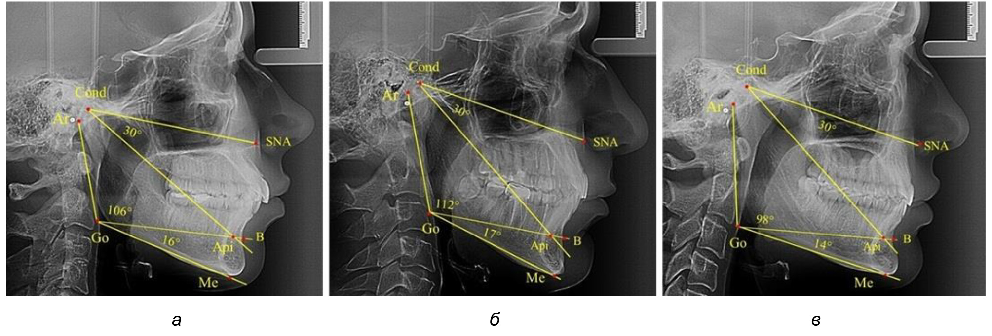 При анализе ТРГ 5 детей в периоде прикуса молочных зубов отмечено, что величина основного угла гнатической части лица SNA-Cond-Api, как правило, в норме составляла около 30°, и его величина была относительно стабильной у всех обследованных детей. В то же время угол нижней челюсти и его составляющие отличались вариабельностью параметров при различных показателях нижнечелюстного угла (рис. 4).