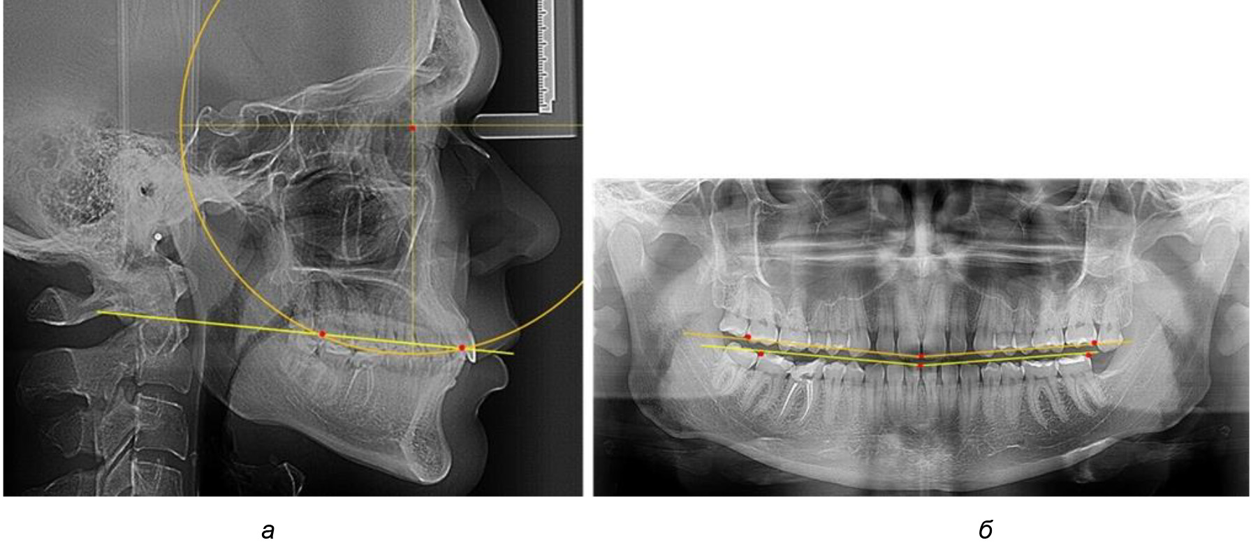 Рис. 4. Особенности кривой Spee на ТРГ (а) и ОПТГ (б) у людей с горизонтальным типом лица