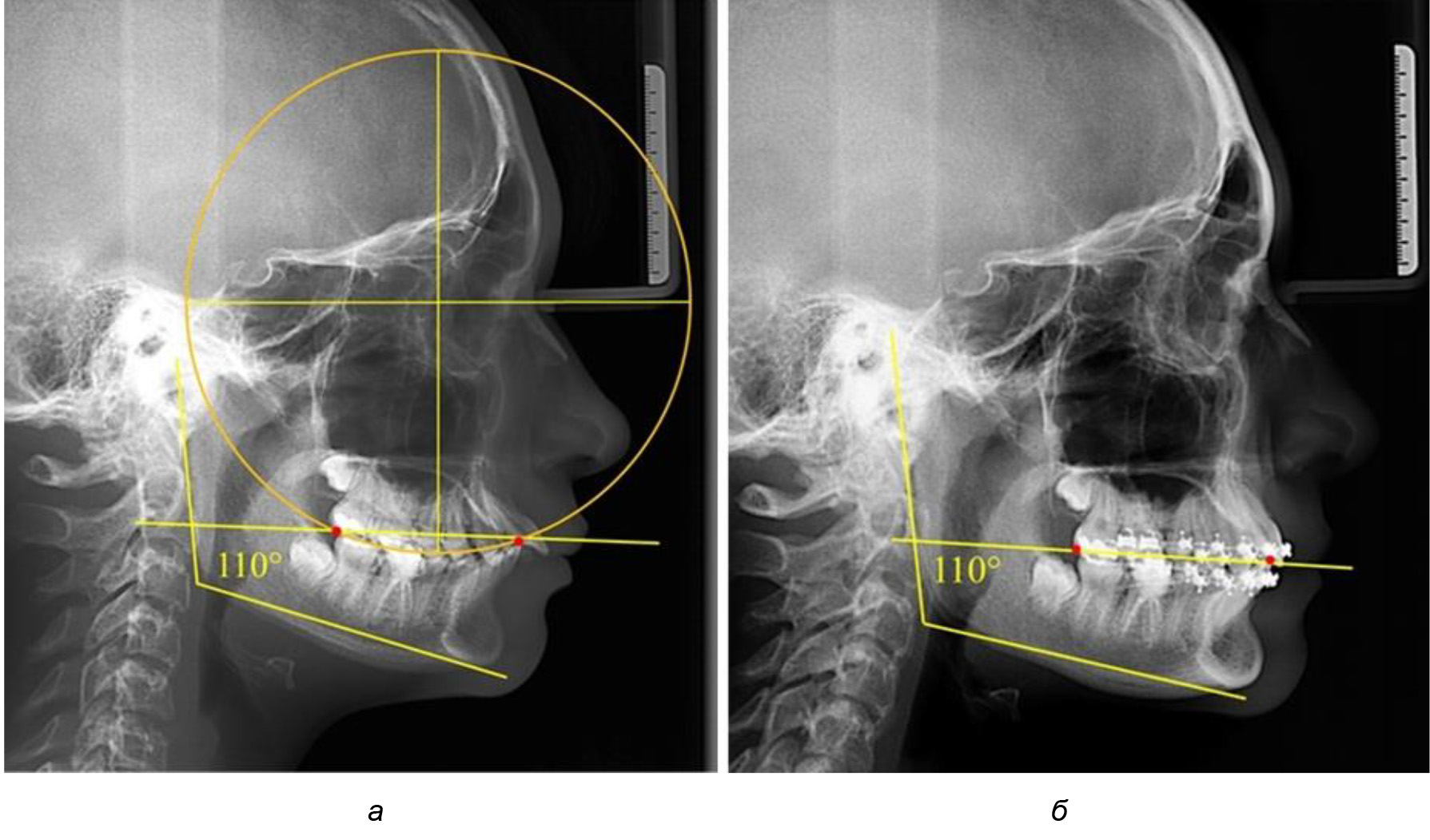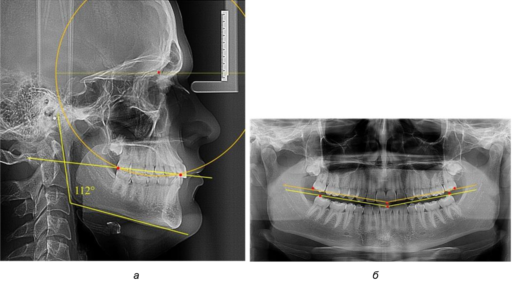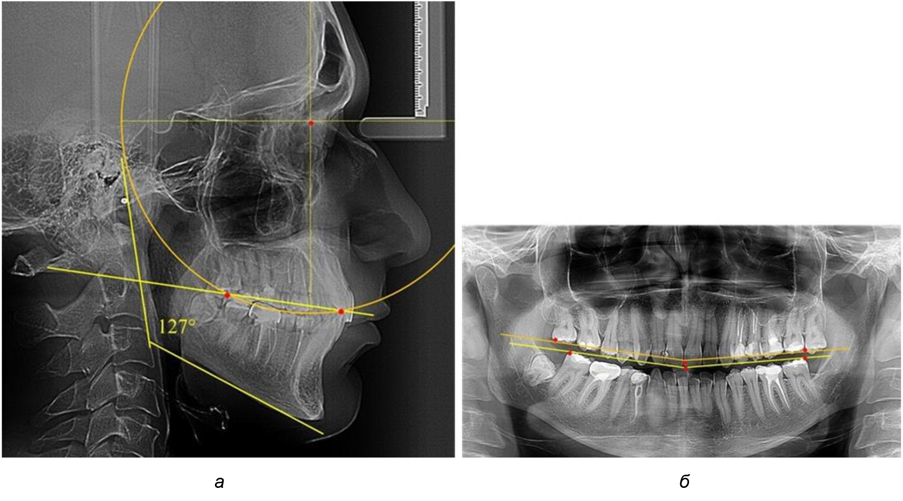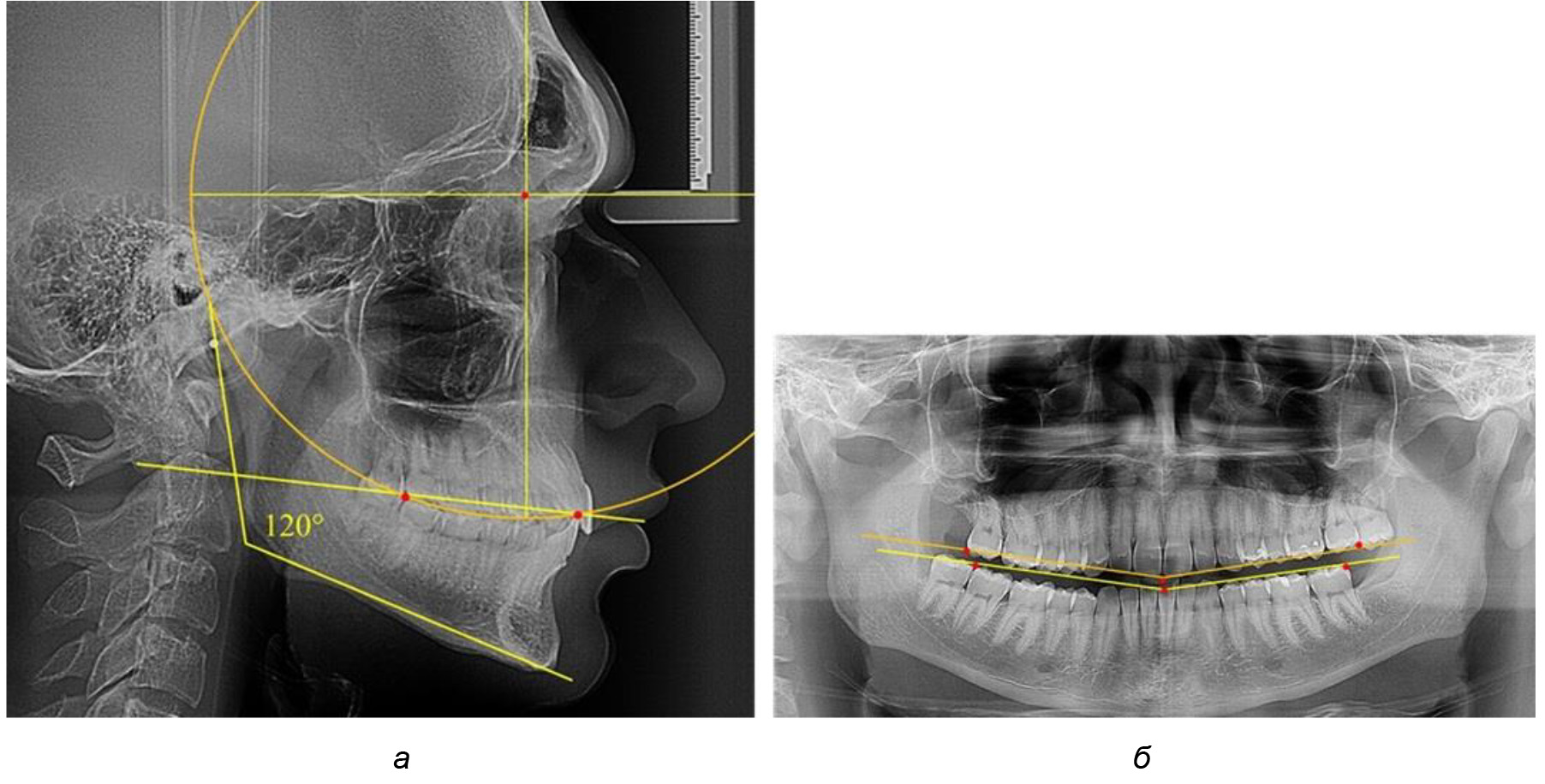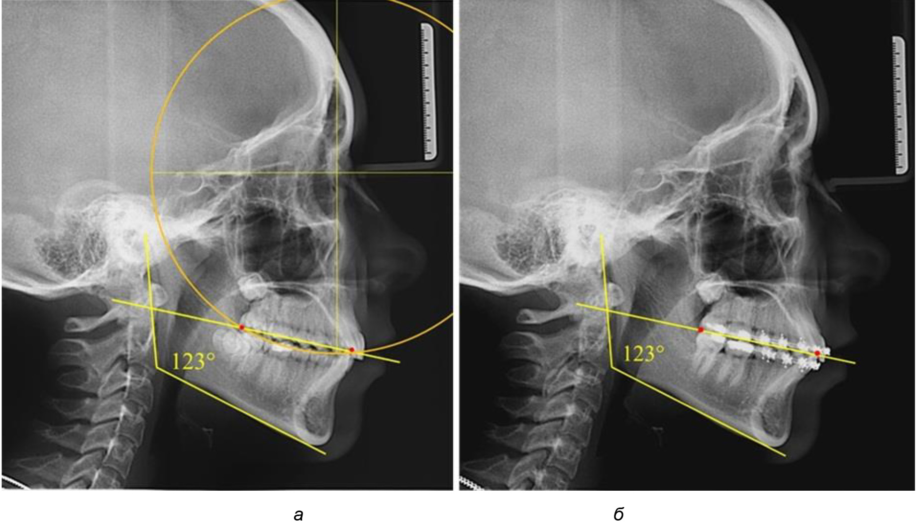 Рис. 5. Особенности ТРГ при патологической кривой Spee до лечения (а) и после лечения (б) техникой «прямой» дуги