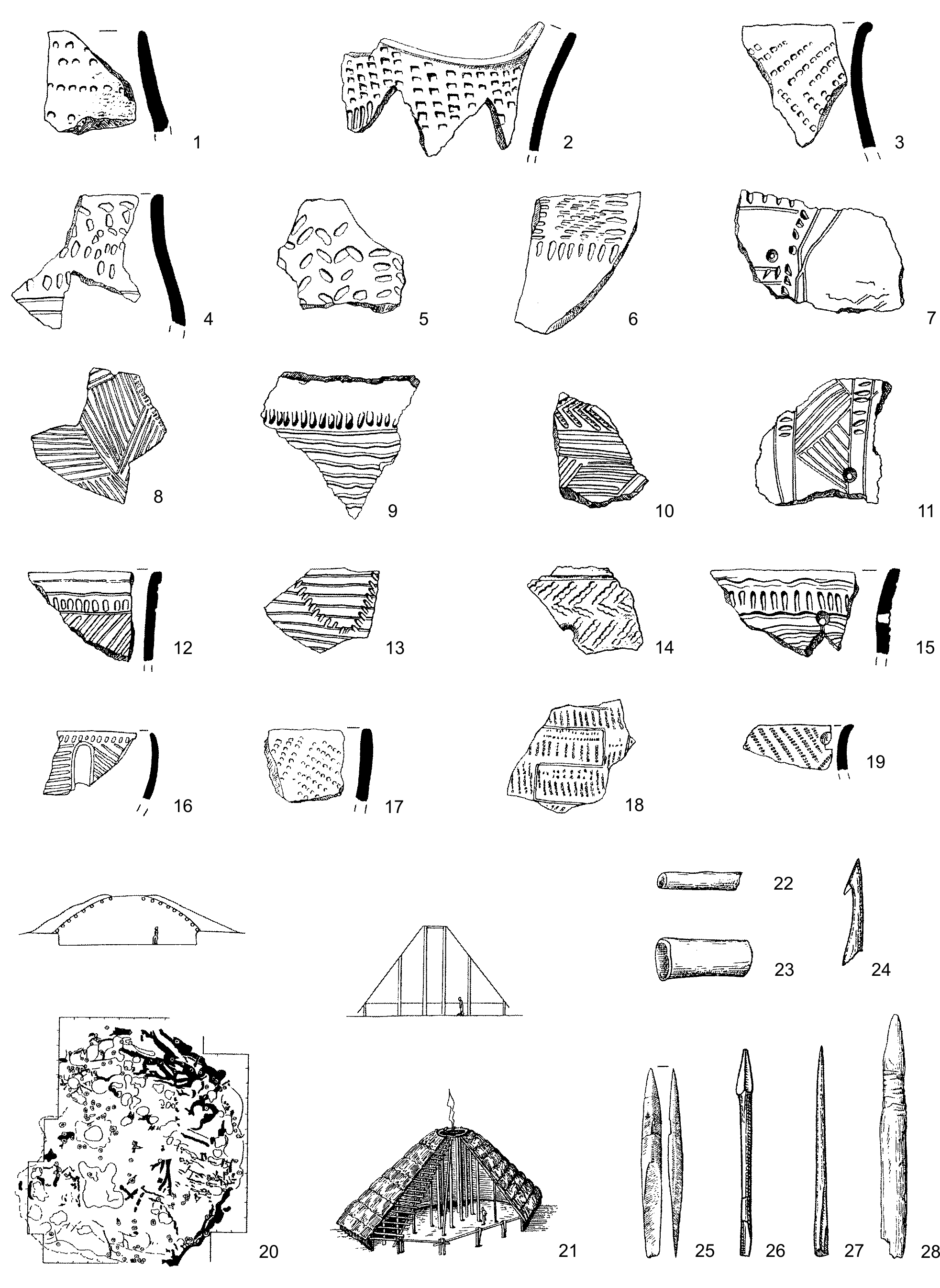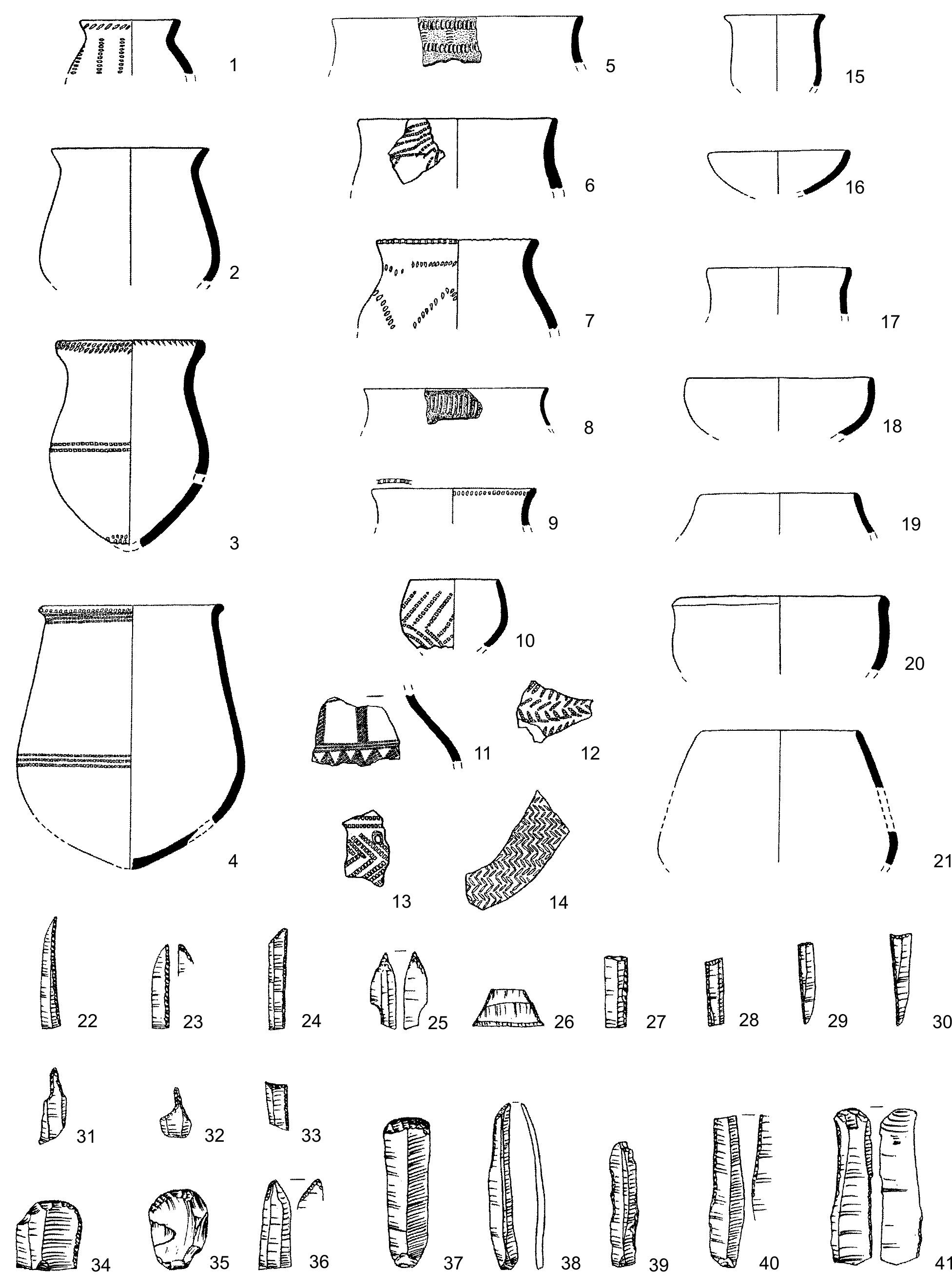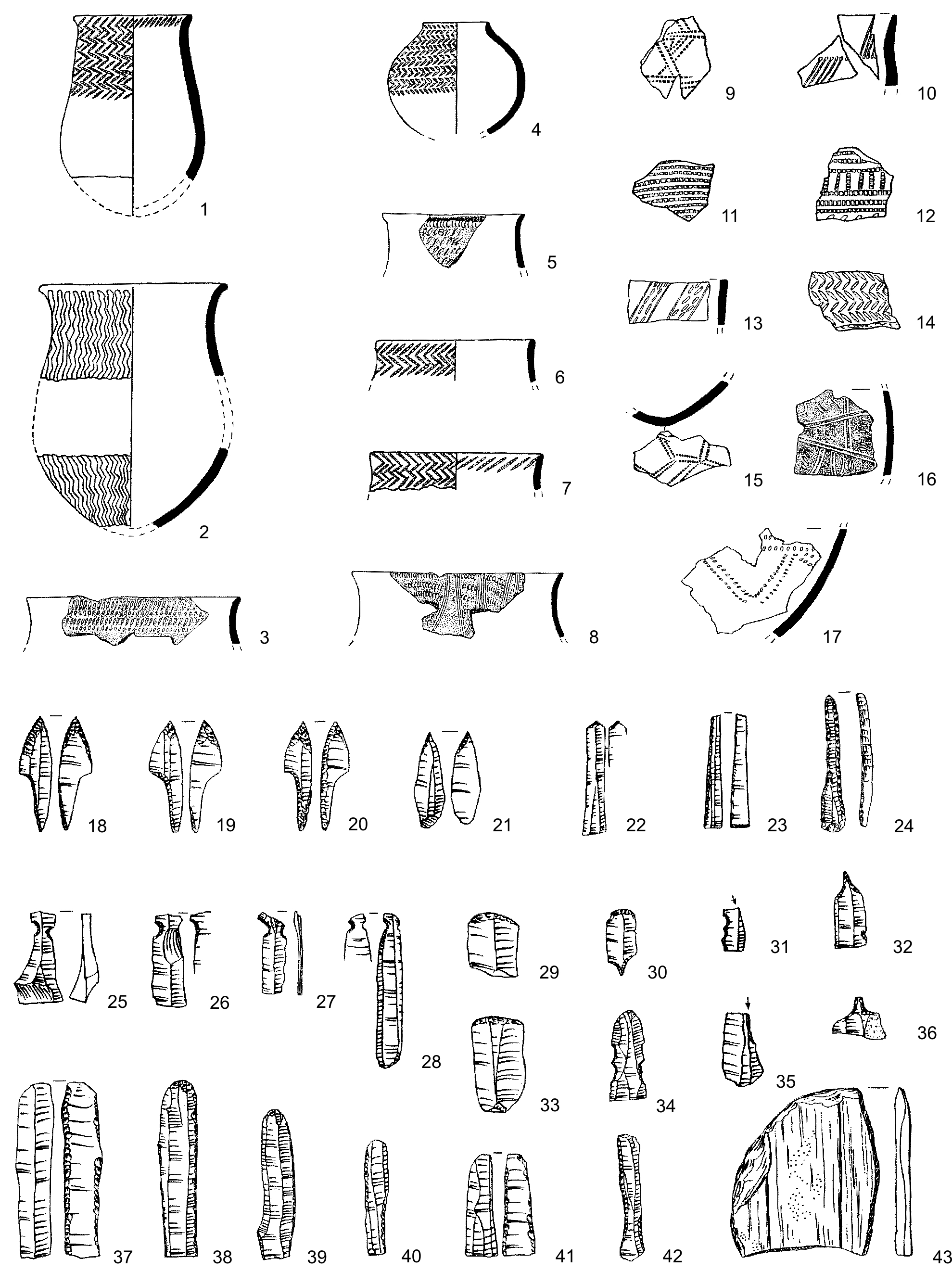 Материалы памятников в районе Лявляканских озер отличаются и от хорезмских, и от заравшанских. В кремневом инвентаре отличие сказывается в широком распространении остроконечного варианта пластинчатых наконечников стрел кельтеминарского типа, крупных плитчатых скребков и изделий типа микрорезцов. В керамике, при общем сходстве, есть формы сосудов, которых нет ни в нижнем Заравшане, ни в Хорезме: сферические горшки со срезанным верхом, небольшие реберчатые сосуды, сосуды с маленьким уплощенным дном, некоторые варианты вертикально-вытянутых крупных сосудов. По сравнению с материалами двух других групп, в ранних комплексах Лявлякана прочерченный орнамент используется значительно реже (только в 25% случаев), зато очень широко применяется зубчатый, обычно в сочетании с насечками. В целом орнаментика лявляканской керамики очень бедна, лишь для небольшой части ранней посуды известны такие сложные композиции, как гирлянда, обычный тип орнамента представлен простой комбинацией двух элементов – елки и зигзага36.