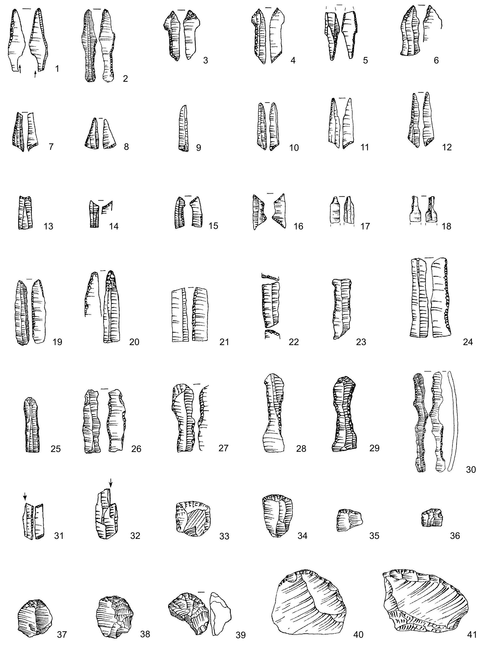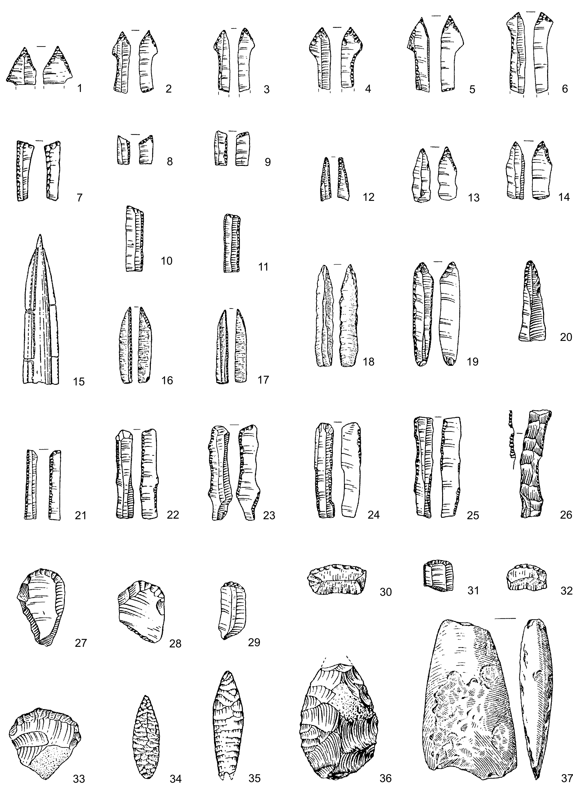 Рис. 8. Кремневый инвентарь среднего этапа кельтеминарской культуры.