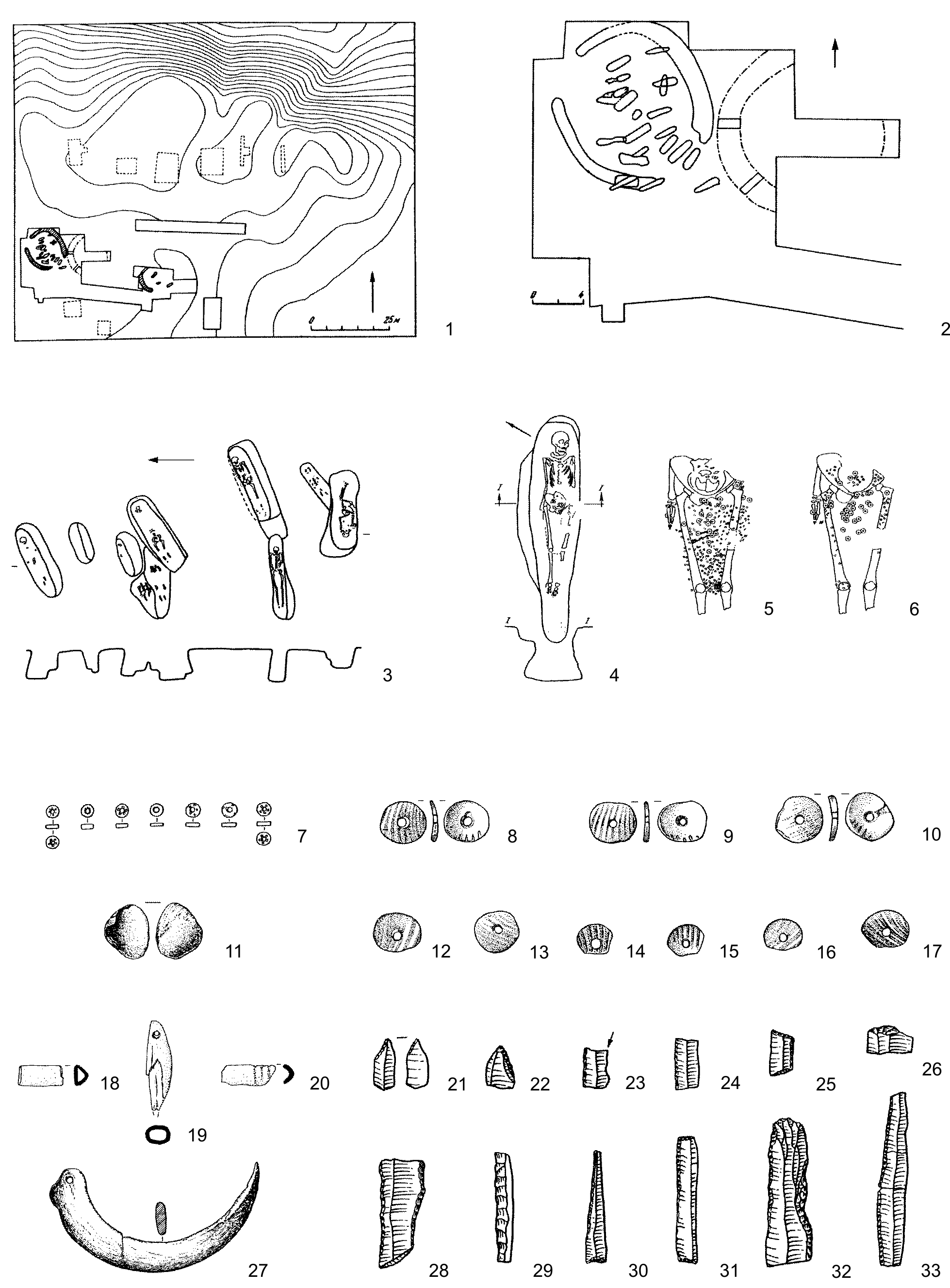 Погребальный обряд кельтеминарской культуры известен по раскопкам двух погребений между стоянками Джанбас-4 и 5 и особенно по материалам могильника Тумек-Кичиджик (рис. 14). Джанбасские погребения сильно разрушены, устанавливаются только очертания могильных ям размером приблизительно 140´80 см и 160´110 см, в которых предполагается скорченное положение по оси северо-восток – юго-запад и, вероятно, север - юг39.
