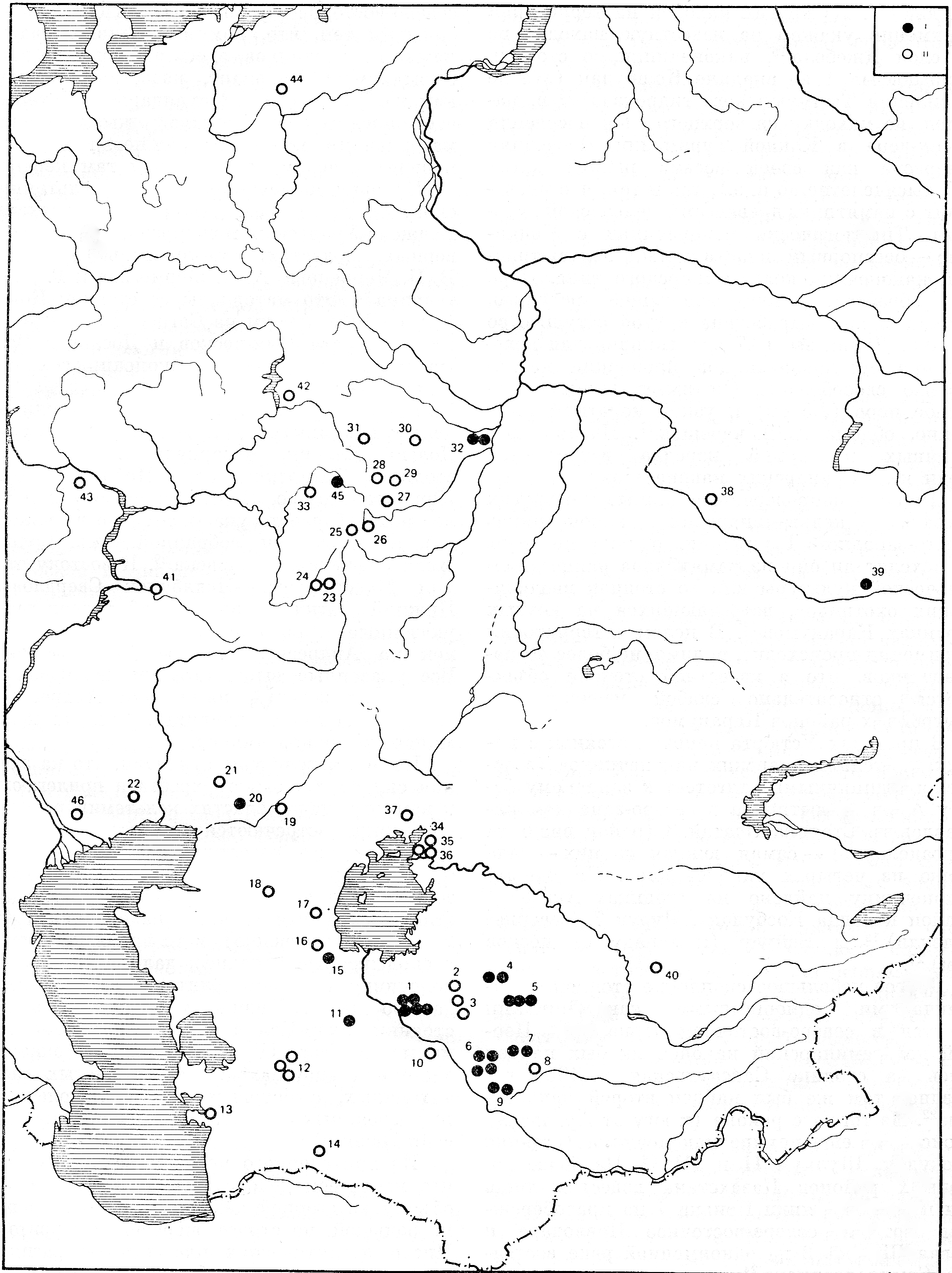 Рис. 15. Схема распространения наконечников стрел кельтеминарского типа: окружность – единичные находки; кружок – группа (Виноградов, 1979, с. 5, рис. 1).