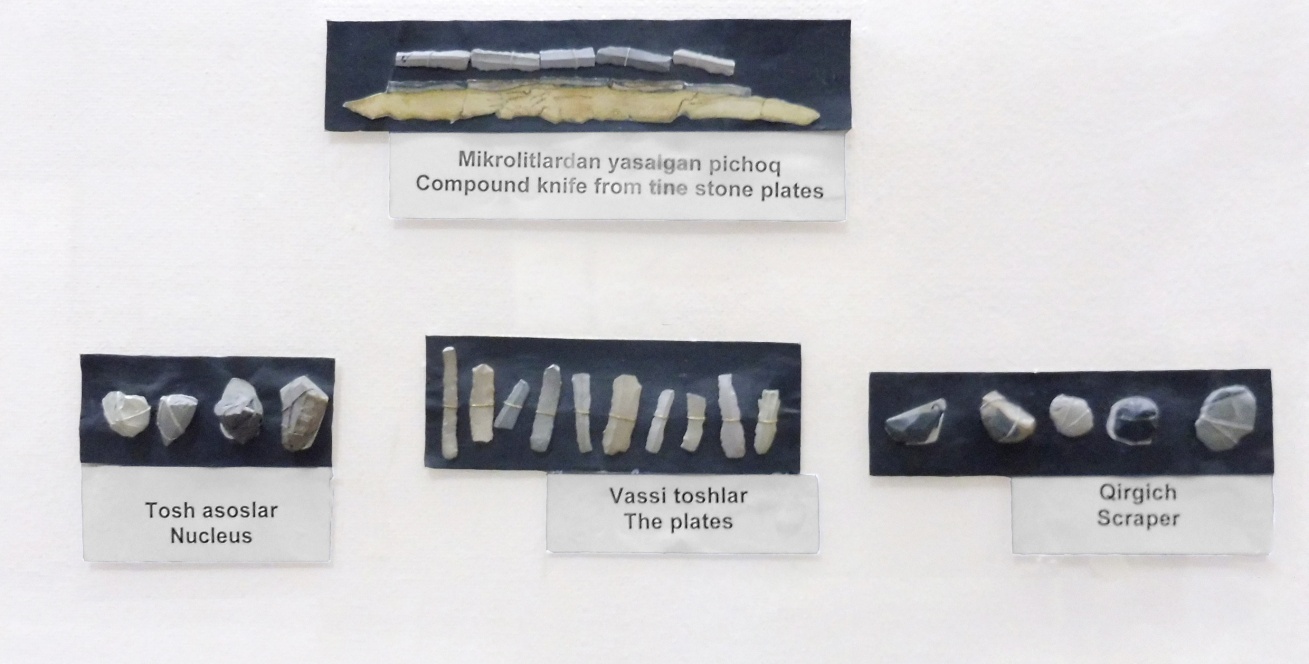 Рис. 16. Кельтеминарские материалы в экспозиции Краеведческого музея г. Ферганы. Сборы в песках Центральной Ферганы.