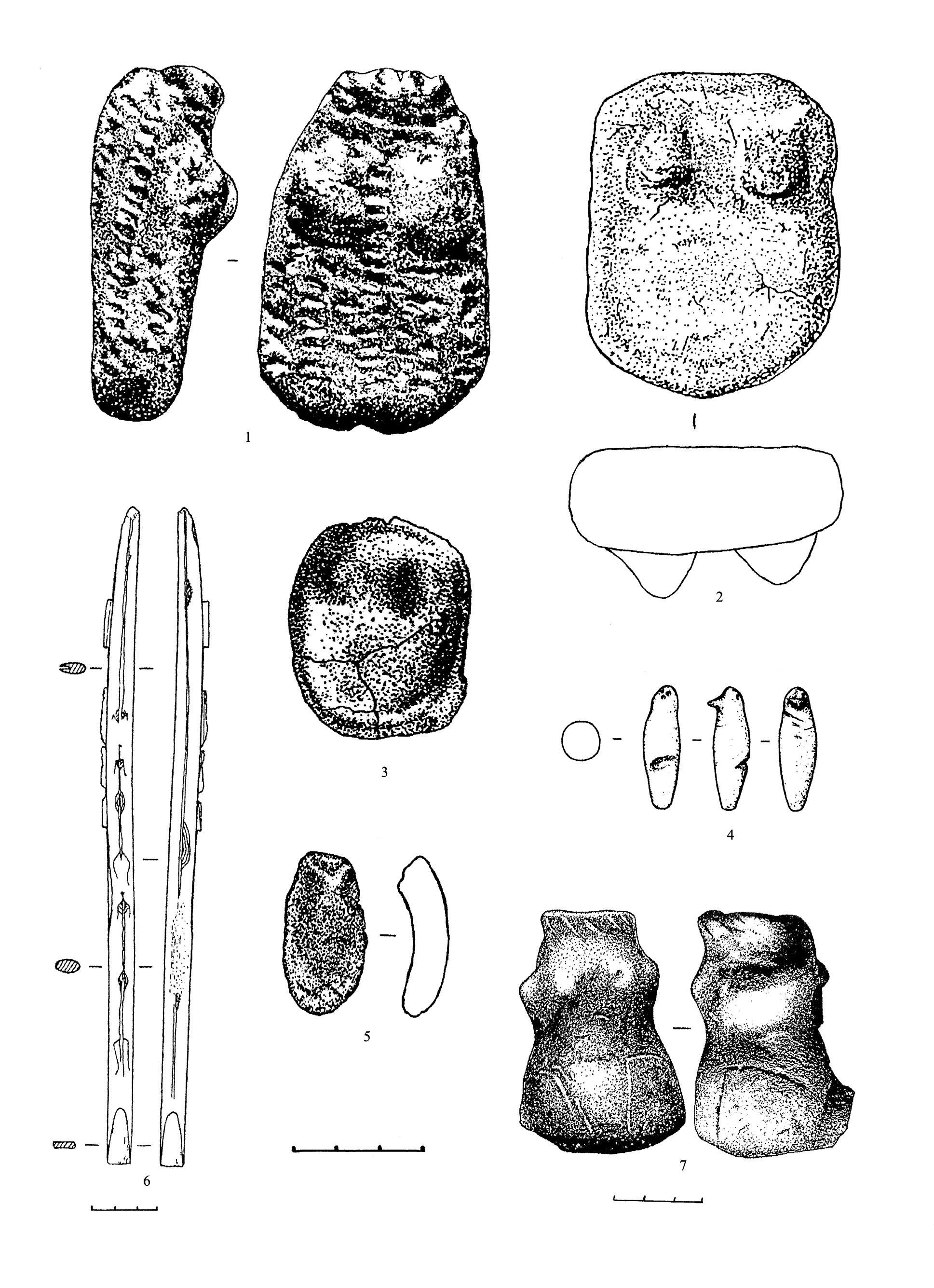 Рис. 1. Антропоморфные изображения из глины (1–5) и кости (6–7). (1 – Березовый мыс; 2–3 – Палатки II; 4 – Усть-Вагильский холм; 5 – Кокшаровское Поле; 6 – Камень Дыроватый; 7 – Лабазы I)