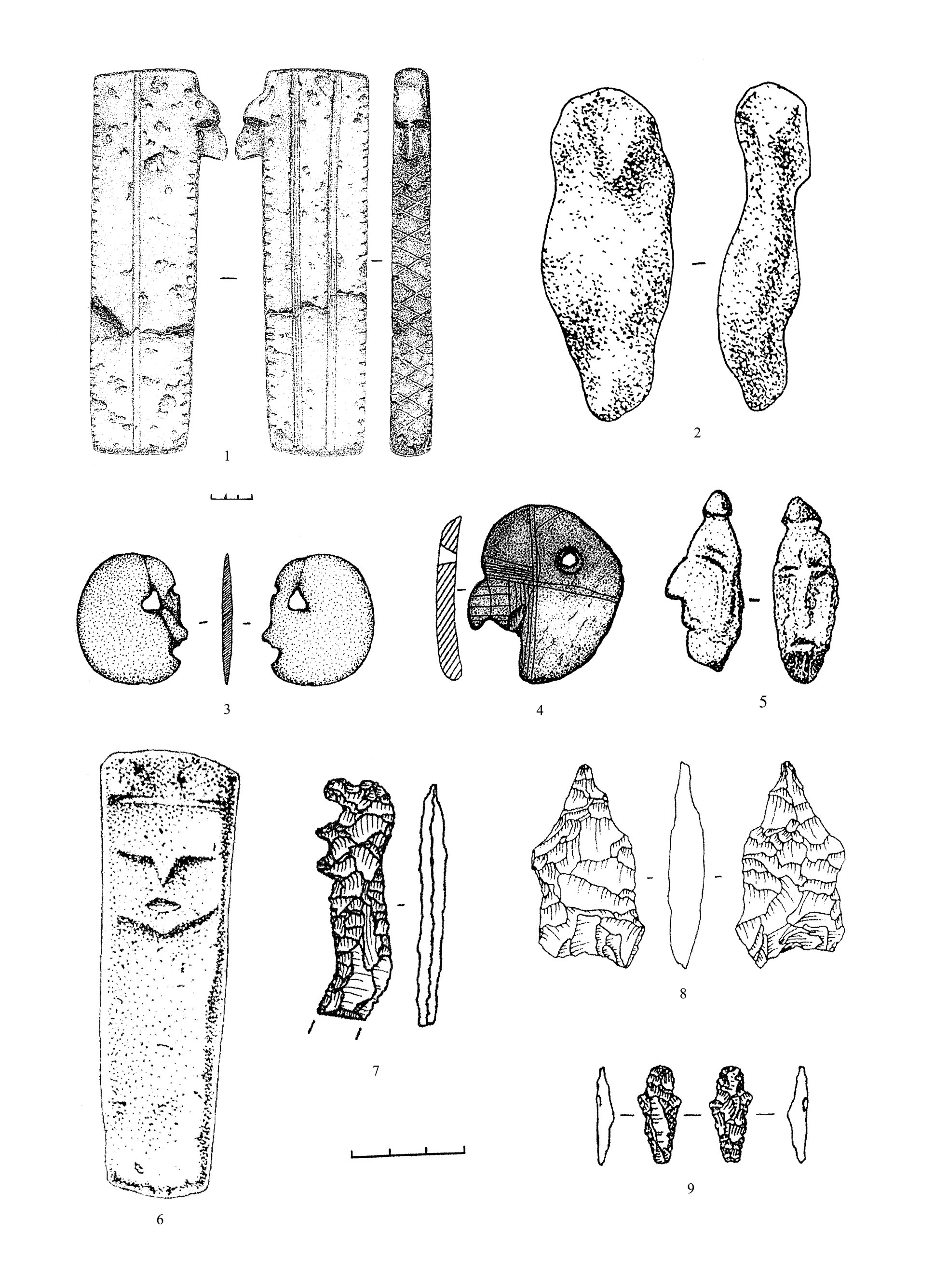 К эпохе мезолита также относится единичная находка. Это вкладышевый наконечник стрелы эпохи мезолита длиной около 20 см, найденный в пещерном святилище на камне Дыроватом (р. Чусовая, Свердловская обл.). На одной из его сторон нанесены изображения двух антропоморфных фигур, расположенных одна под другой. Поскольку изобразительным полем является узкая плоскость наконечника стрелы, фигуры сильно заужены. Маленькая головка изображена короткими насечками, прямые руки опущены вниз, грудная клетка показана в скелетном стиле. Часть фигуры от грудной клетки до начала ног сильно удлинена и показана двумя параллельными линиями. Посередине предполагаемого туловища оно разделяется на две части округлым вздутием из скобчатых линий. Возможно, вздутый живот обозначает беременную женщину. Ноги показаны кривыми линиями. Линии, обозначающие туловище, выходят между ног в одном случае короткими отрезками, а в другом длинными и неодинаковыми. Что они изображают – непонятно. У верхней фигуры это могло быть изображением фаллоса, а у нижней – хвоста (рис. 1, 6). Как эти мужские символы совместить с женскими – остается загадкой. Необходимо добавить, что обе фигуры окрашены охрой2.