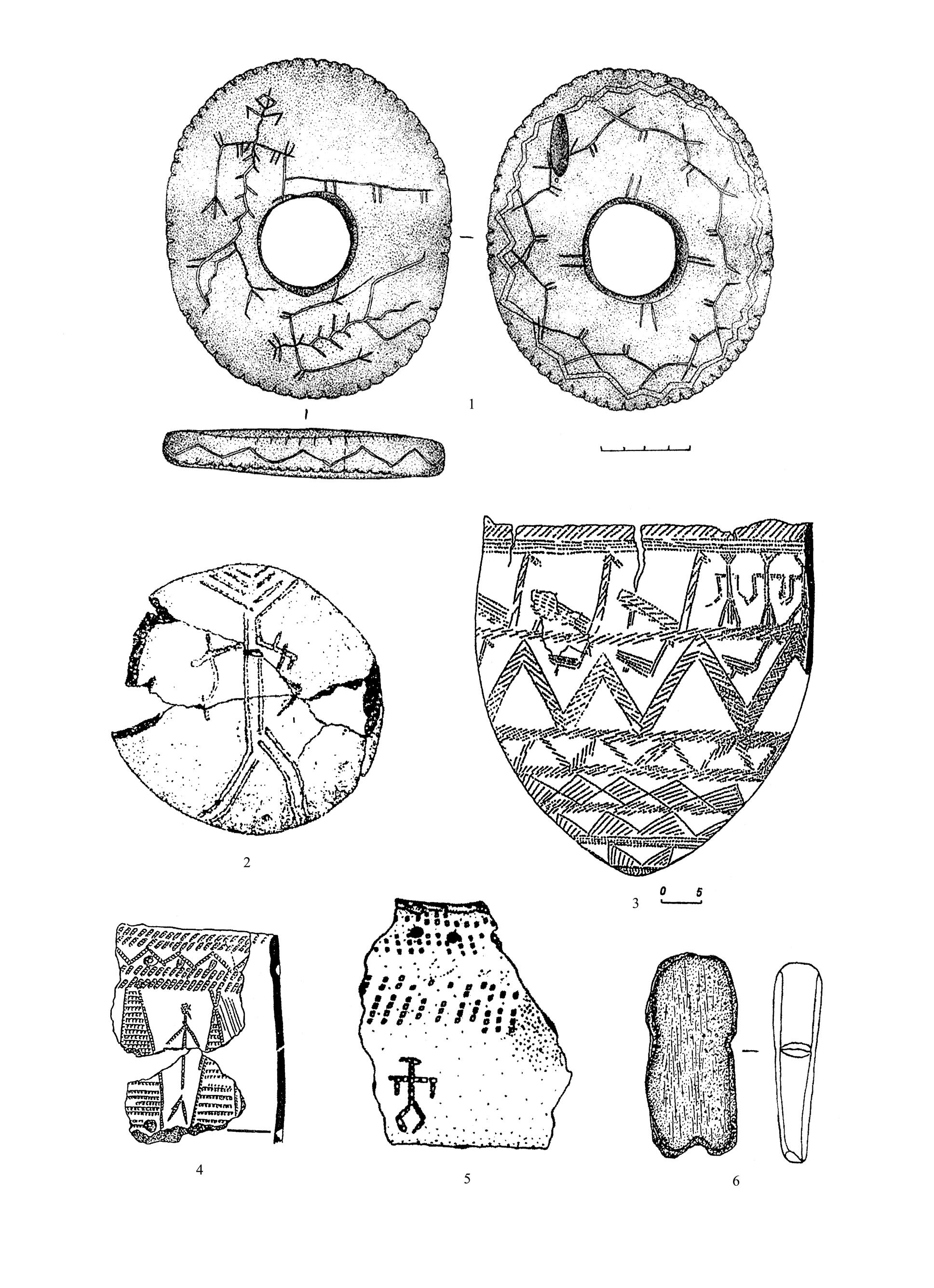 Уникальное изделие с гравировками обнаружено в окрестностях г. Нижнего Тагила у пос. Антоновский (Свердловская обл.)28. Оно найдено на склоне горы, где никаких следов археологического памятника не выявлено. Изделие в виде крупного диска имеет овальную форму, диаметр длинной оси 14 см, короткой – 11,8 см. Толщина диска 1,5 см (рис. 3, 1). Он изготовлен из мягкого хлоритизированного сланца. Все поверхности – лицевая, оборотная и ребро – тщательно отшлифованы. В центре изделия находится круглое отверстие диаметром 3,5 - 3,7 см. По боковым граням диска с двух сторон металлическим орудием прорезаны крупные насечки. На лицевой стороне в одном горизонтальном поясе с отверстием по обе его стороны нанесено по три насечки, в верхнем полукружии расположено 29 насечек, в нижнем – 20. На оборотной поверхности по обе стороны отверстия нанесено 4 и 3 насечки, в верхнем полукружии – 28, в нижнем – 26. На ребре изделия присутствует орнамент в виде зигзагообразной линии. Такая же зигзагообразная линия (только сдвоенная) нанесена и на оборотной стороне. Она идет по всему периметру диска вдоль орнаментированной насечками грани. Ниже зигзага, в центральной части плоскости располагается более сложный орнамент. Он состоит из тупых углов, соединенных между собой лучами. В одном месте, где лучи не соединяются, имеется разрыв. На вершине каждого угла (за исключением одного) присутствуют парные насечки. Таких углов всего двенадцать. Вокруг отверстия в вертикальной и горизонтальной плоскости нанесены длинные сдвоенные насечки.