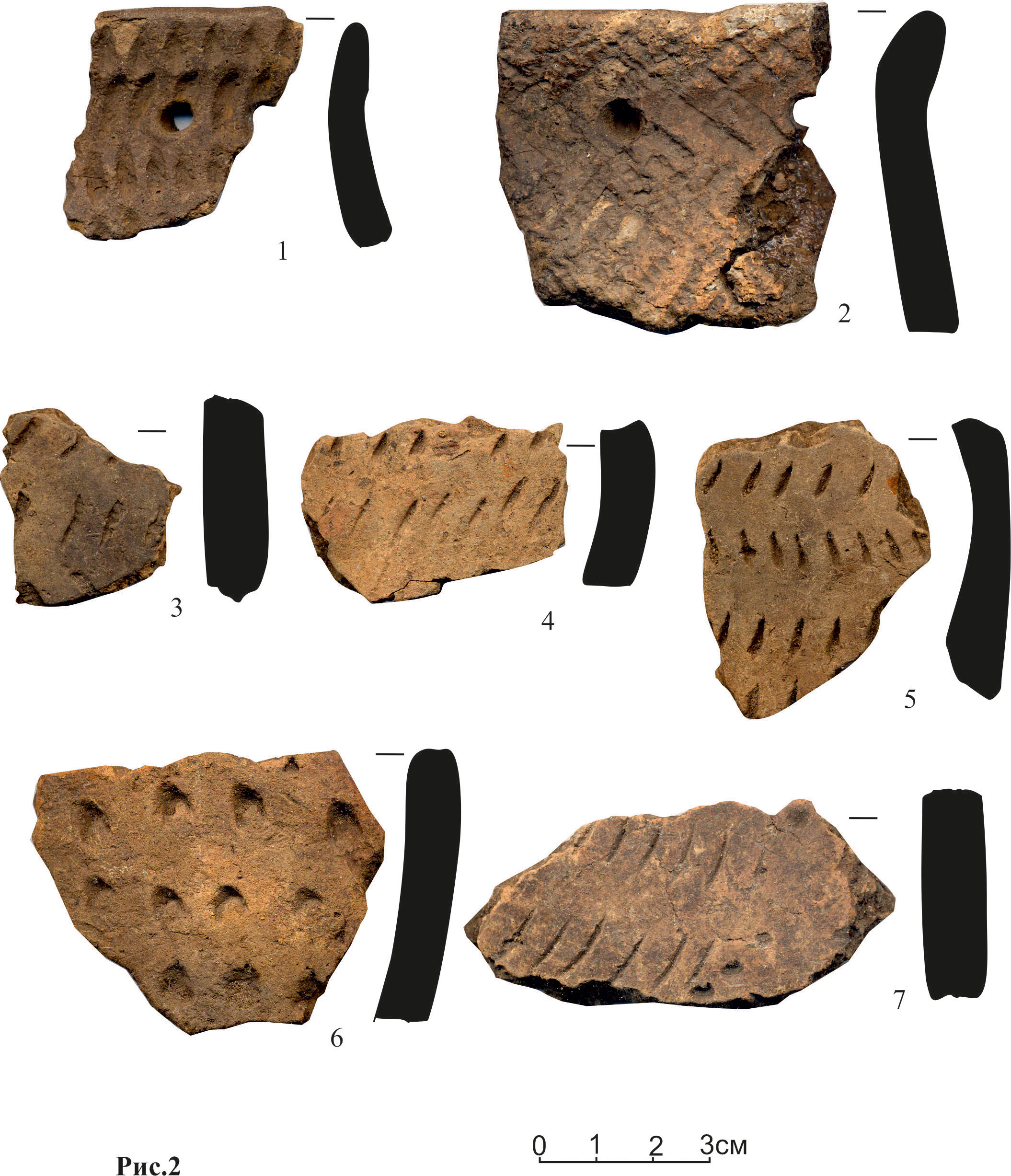 Со вторым этапом функционирования поселения, вероятно, следует связать немногочисленные фрагменты керамики русско-азибейского типа (Рис. 2: 1-2). По всей внешней поверхности этой керамики присутствует орнаментация, выполненная короткими гребенчатыми штампами. Дополнительными элементами орнаментации выступают круглые ямочные вдавления, расположенные под воротничковым оформлением венчика. Судя по фрагментам сосуды имели прикрытую профилировку. Толщина керамики составляет 0,7-0,9 см, в формовочной массе которой присутствует обильная примесь песка и шамота.