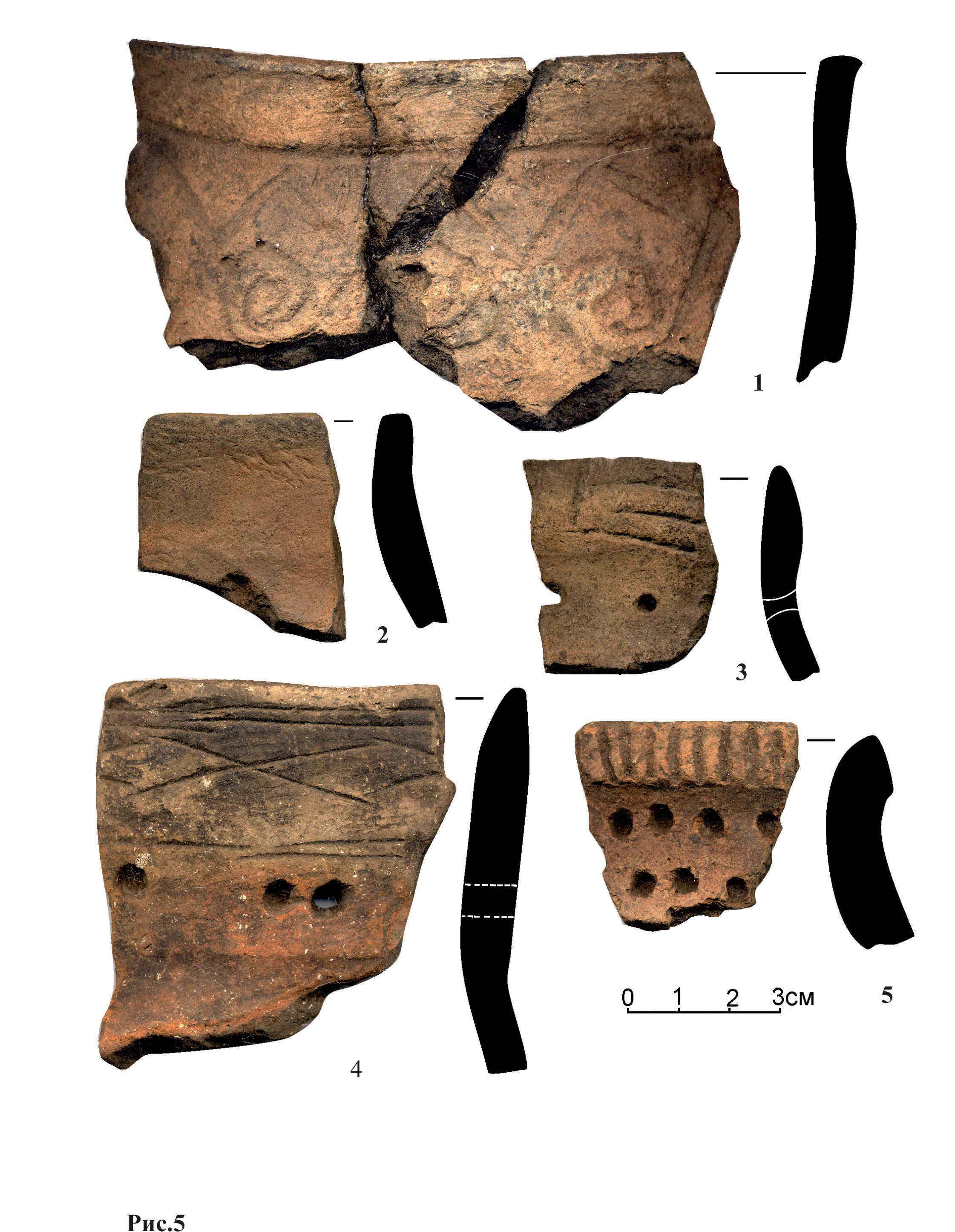 Это керамика серого и оранжевого цвета с примесью раковины в глине. Внешняя поверхность сосудов гладкая, орнамент размещался преимущественно на горловине и в верхней части сосуда (Рис. 5: 3-4). Характерной особенностью этой керамики является группировка ямок и наличие плоского воротничка. Близкая по облику керамика маклашеевской культуры была обнаружена в ходе исследований и Игимской стоянки (раскоп II)22.