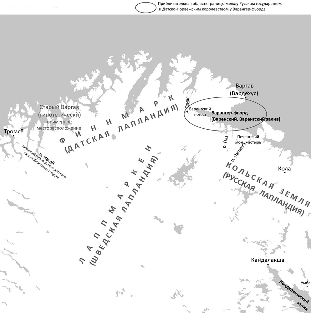 13 Судя по всему русско-датская (русско-норвежская) «политическая» граница в Лапландии одновременно сосуществовала с общим русско-датским налогооблагаемым округом. См. подробнее об этой конфигурации русско-датского пограничья: Pape C. Three Forgotten Border Treaties: Implications for Our Understanding of the Medieval Russian-Norwegian Frontier // Russia and Norway: Physical and Symbolic Borders. Moscow, 2005. P. 29-39.