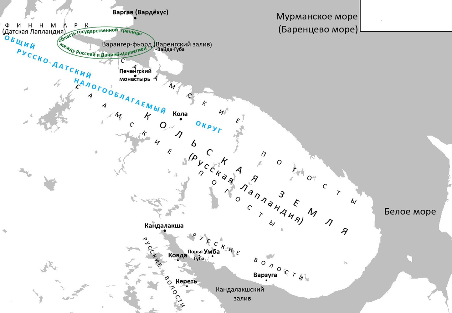 - Судя по всему русско-датская (русско-норвежская) «политическая» граница в Лапландии одновременно сосуществовала с общим русско-датским налогооблагаемым округом. См. подробнее об этой конфигурации русско-датского пограничья: Pape C. Three Forgotten Border Treaties: Implications for Our Understanding of the Medieval Russian-Norwegian Frontier // Russia and Norway: Physical and Symbolic Borders. Moscow, 2005. P. 29-39.