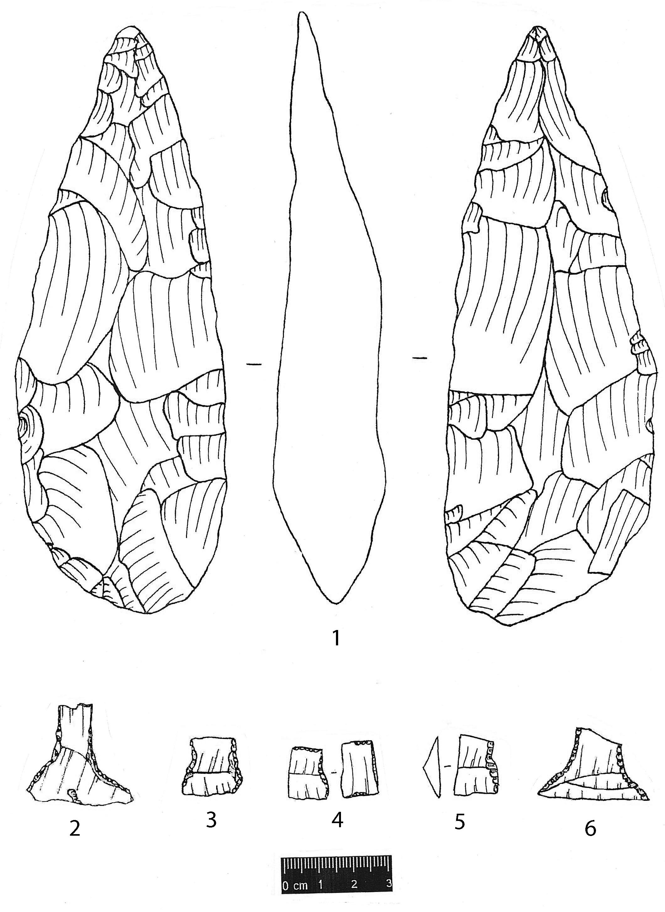 Присутствие на памятнике изделий раннего палеолита является одной из его особенностей. В 1985 г. на стоянке было обнаружено несколько крупных и массивных отщепов с рельефно выраженными ударными бугорками и скошенными под тупым углом к плоскости скалывания ударными площадками. Кроме архаичных отщепов в комплексе были выявлены массивные изделия типа бифасов. Целиком сохранился только один бифас размером 16,0×5,8×3,0 см. С двух сторон бифас обработан крупными и средними сколами до получения вытянутой слегка асимметричной листовидной формы (рис. 1, 1). От сломанных бифасов сохранились верхние части размером 13,6×9,7×1,8 см и 9,3×5,3×2,4 см. Все бифасы изготовлены из зеленоватого тонкозернистого песчаника, по структуре и окраске очень похожего на змеевик (серпентинит). Использование данного сырья на территории Среднего Зауралья отмечено впервые. Аналогий данным изделиям в каменном веке Урала нет2.