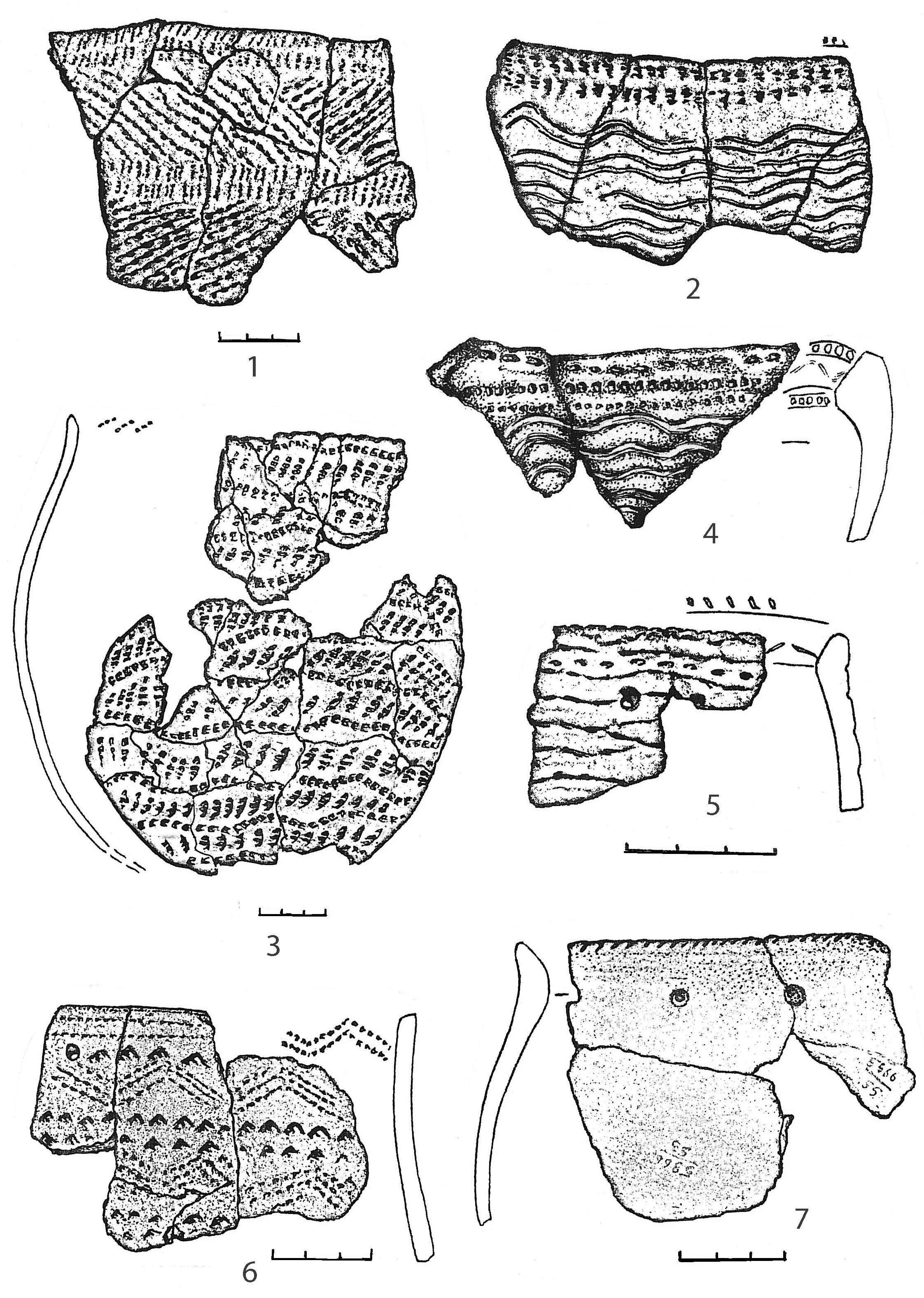 Керамический комплекс состоит из 4259 фрагментов разных эпох и культурных типов. Неолит (рис. 2; 1, 2, 4, 5) представлен 848 фрагментами сосудов кокшаровско-юрьинского типа, кошкинского и полуденского типов.