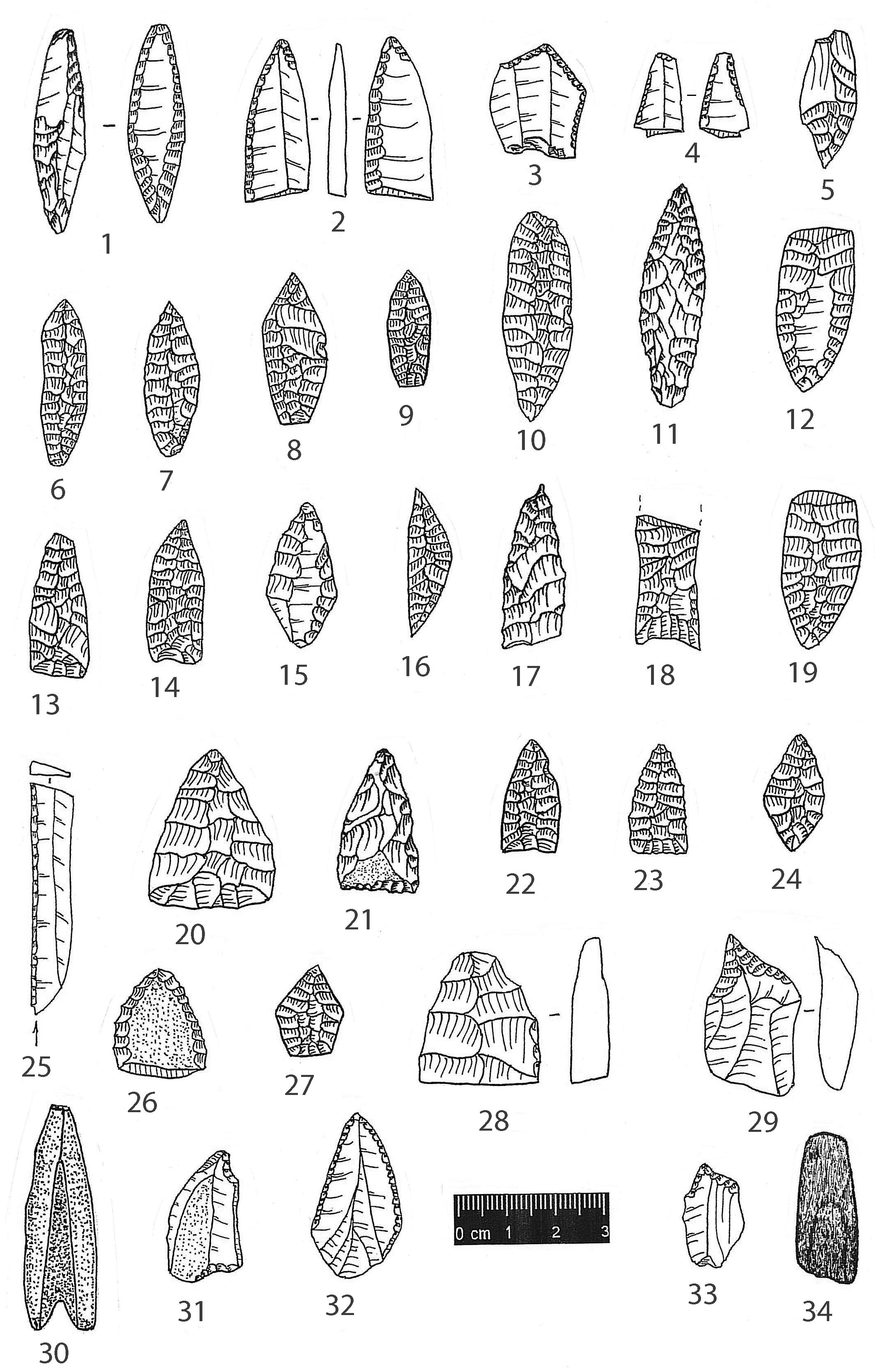 Три острия изготовлены на пластинах светло-серой слабоокремнелой породы. Одно имеет слабо изогнутый кончик пера и подработанный ретушью насад (рис. 3, 31). Второе – обработано мелкой ретушью со спинки в виде широкого треугольника (рис. 3, 32). Третье острие имеет асимметричную форму. Один его край обработан ретушью со спинки, второй – ретушью с брюшка (рис. 3, 2). Еще два острия выполнены из отщепов углистого сланца (рис. 3, 33) и халцедона. Острие из халцедона имеет четко выраженные плечики, обработанные крутой ретушью со спинки, и скошенное основание, оформленное ретушью с брюшка (рис. 3, 29). Последнее острие изготовлено из плитки халцедона.